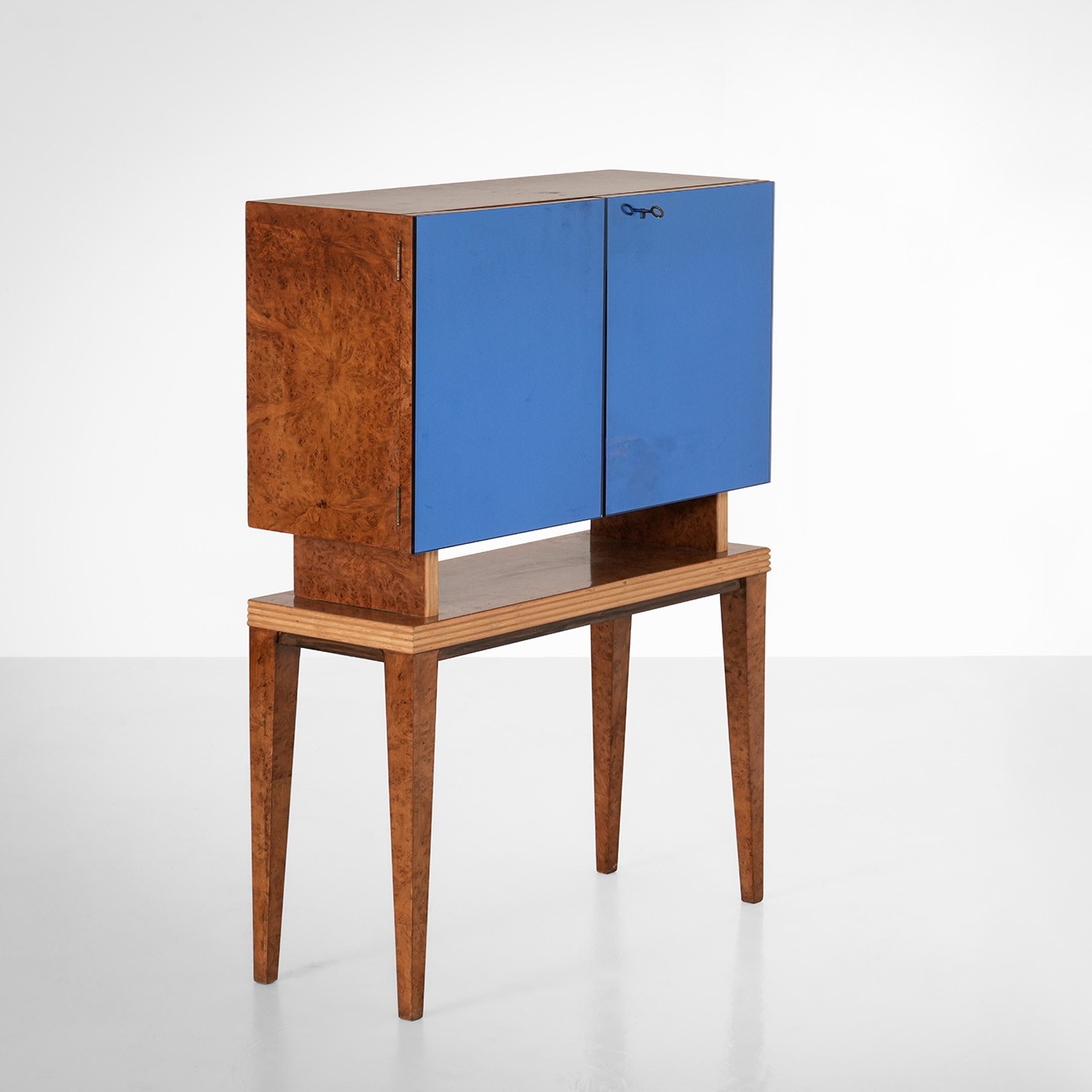 Struttura in legno e impiallacciatura di radica. Ante rivestite di vetro colorato. Interni in cristallo molato e specchiato.