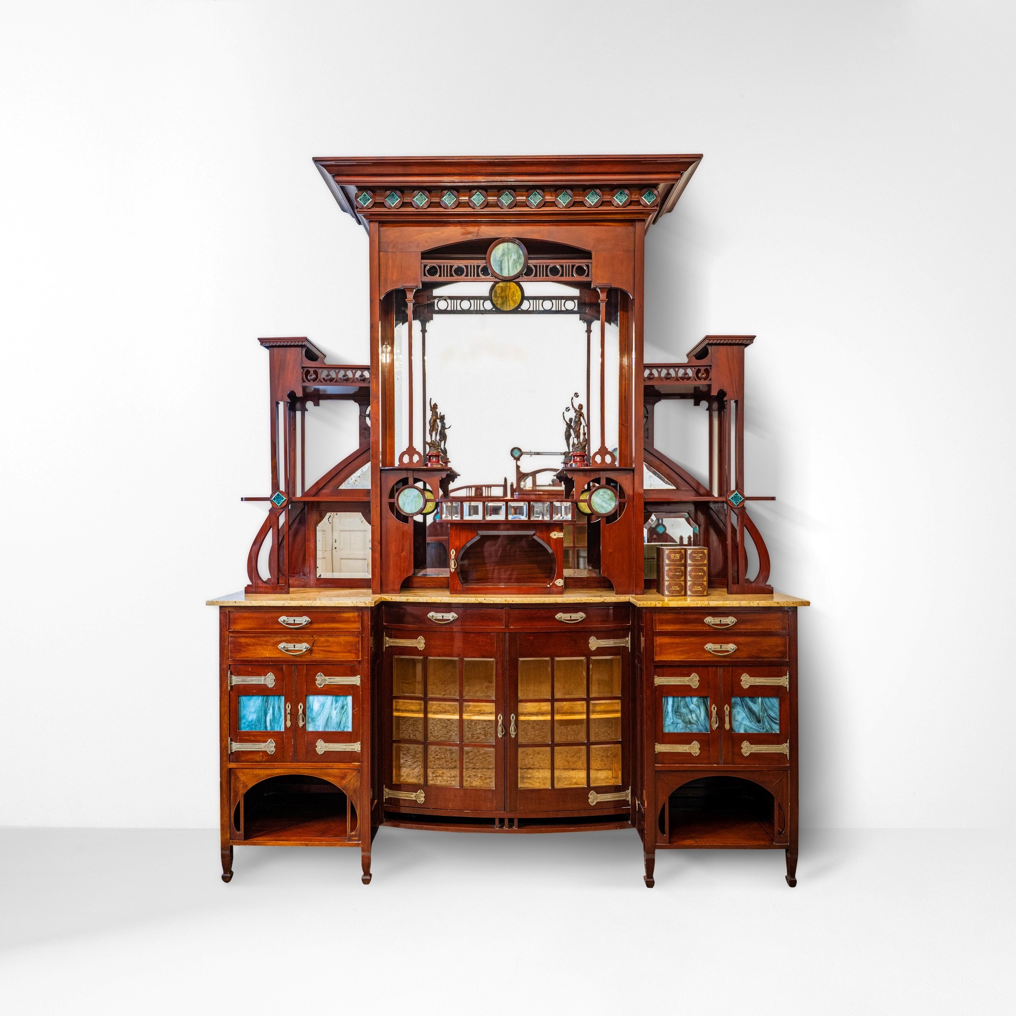 Struttura in legno e legno impiallacciato, dettagli in pietra dura e ceramica smaltata. Sculture in metallo patinato (non pertinente). Piano in marmo. Maniglie e serrature in ottone.