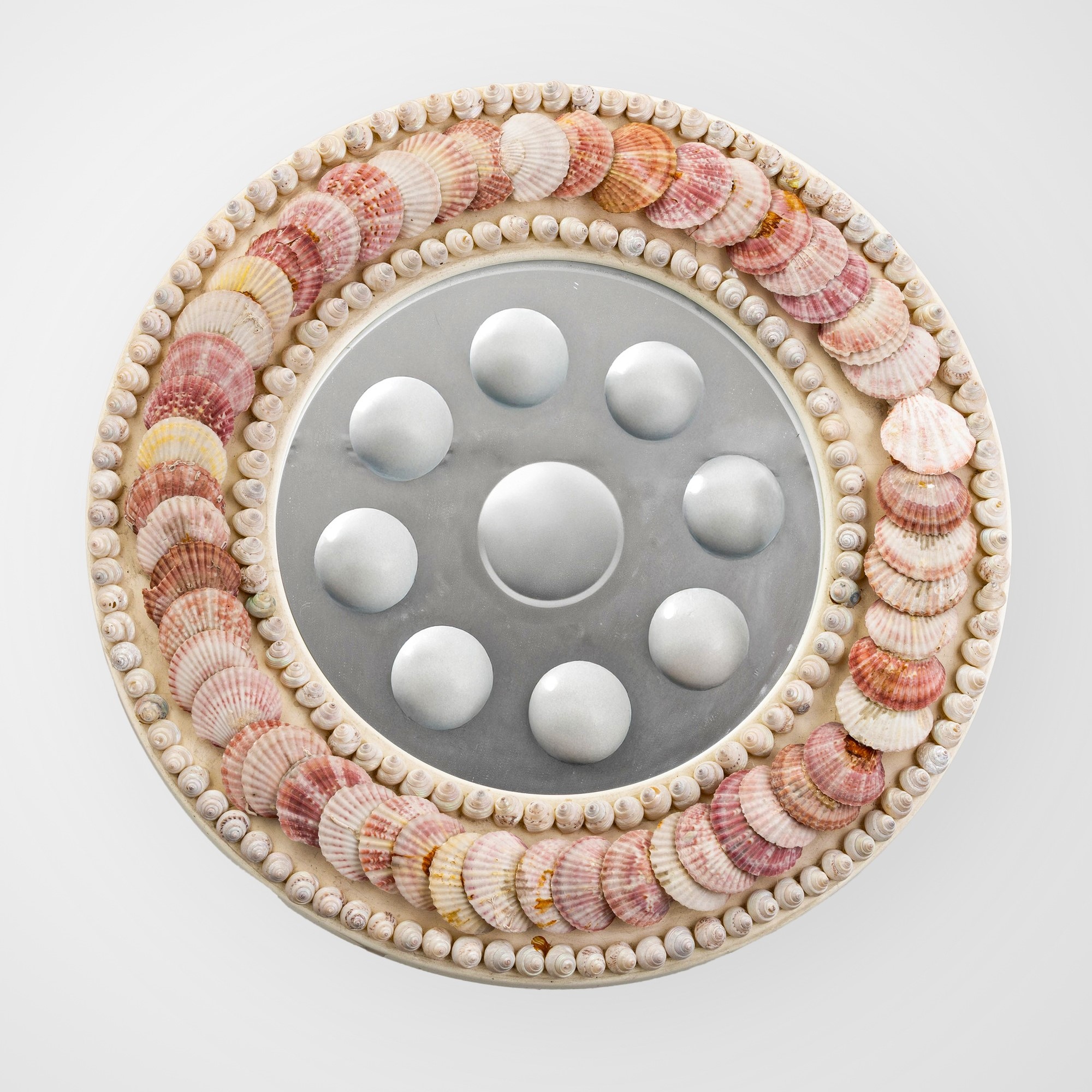 Cornice in legno laccato, cristallo specchiato a lente e applicazioni di elementi a conchiglie.