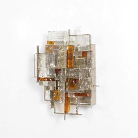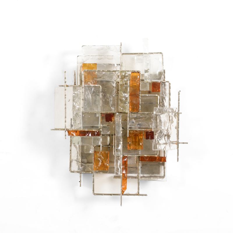 Struttura in metallo e diffusori in vetro policromo.