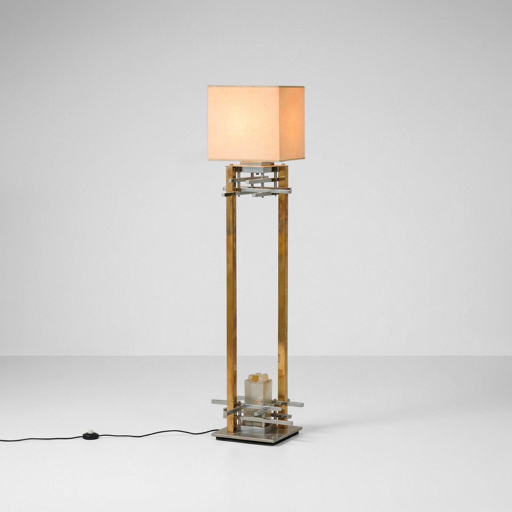 Base e struttura in ottone, metallo cromato ed elementi in vetro. Paralume in tessuto.
