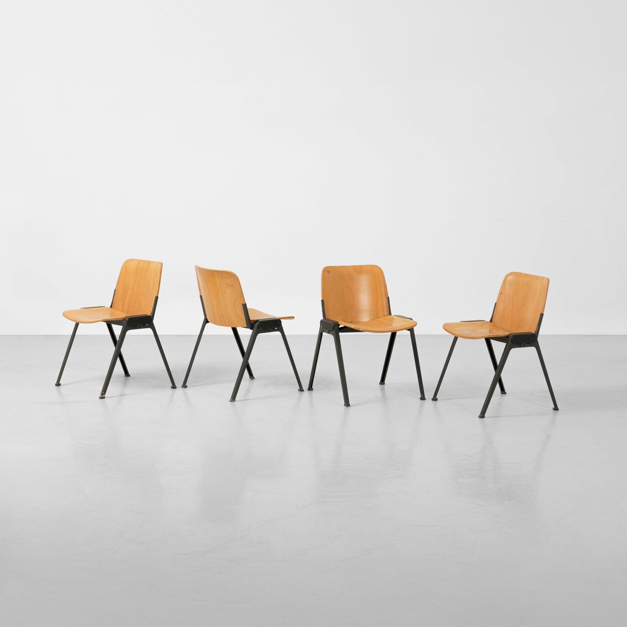Struttura e sostegni in metallo laccato, seduta e schienale in legno.