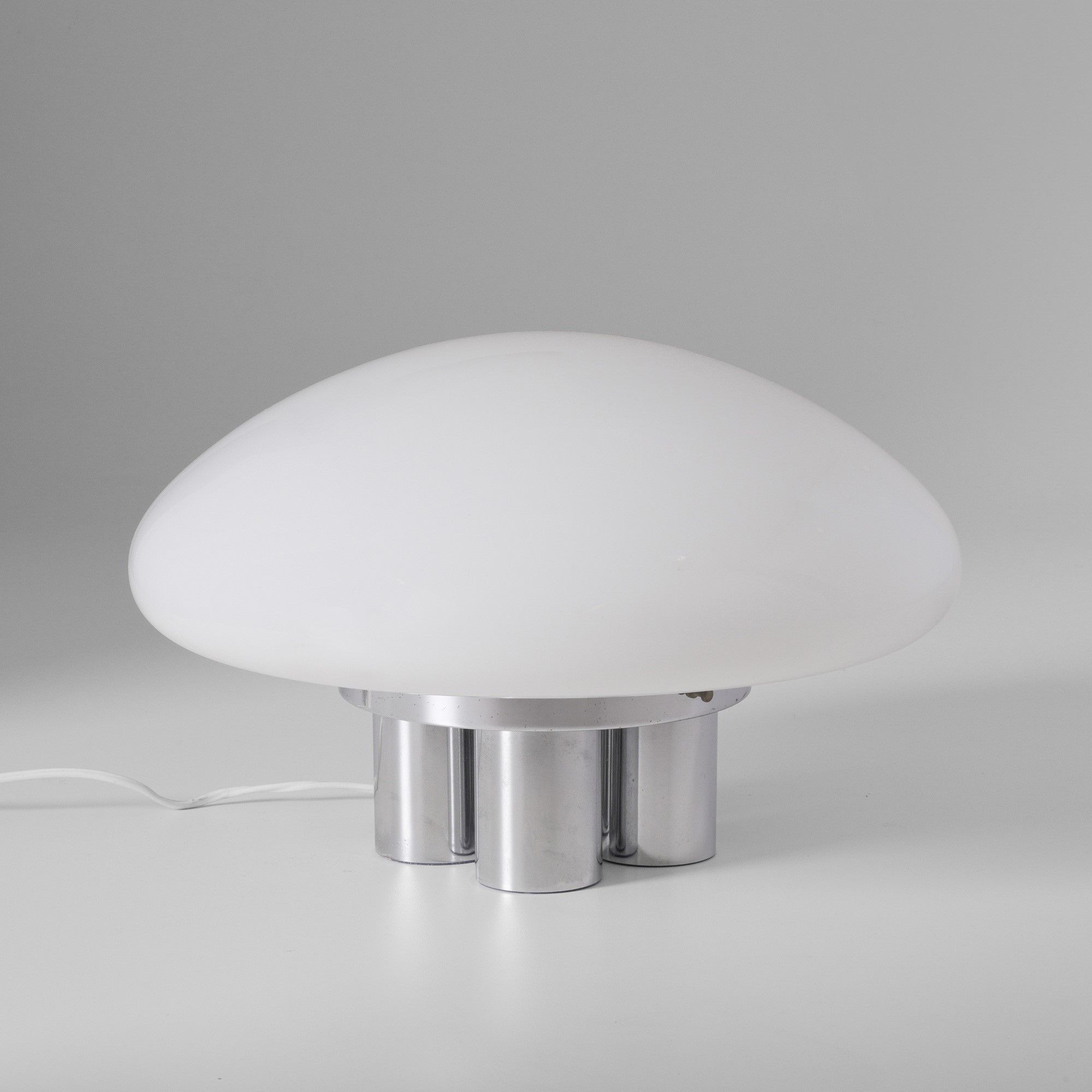 Struttura in metallo cromato e diffusore in vetro opalino.