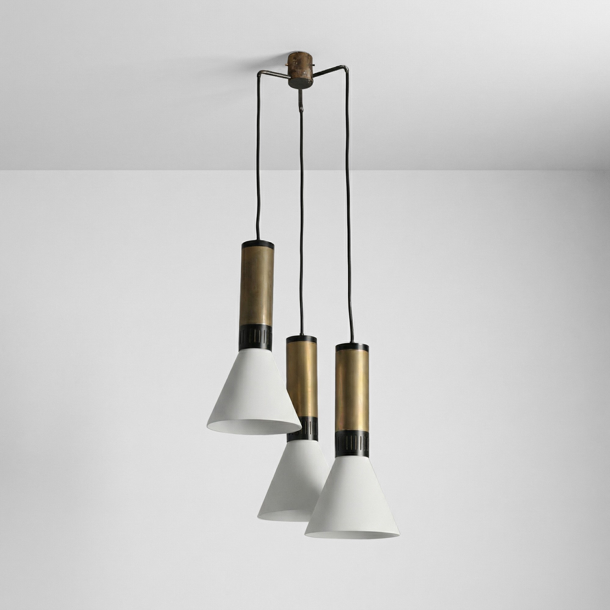 Struttura in metallo e ottone. Diffusori in vetro opalino.