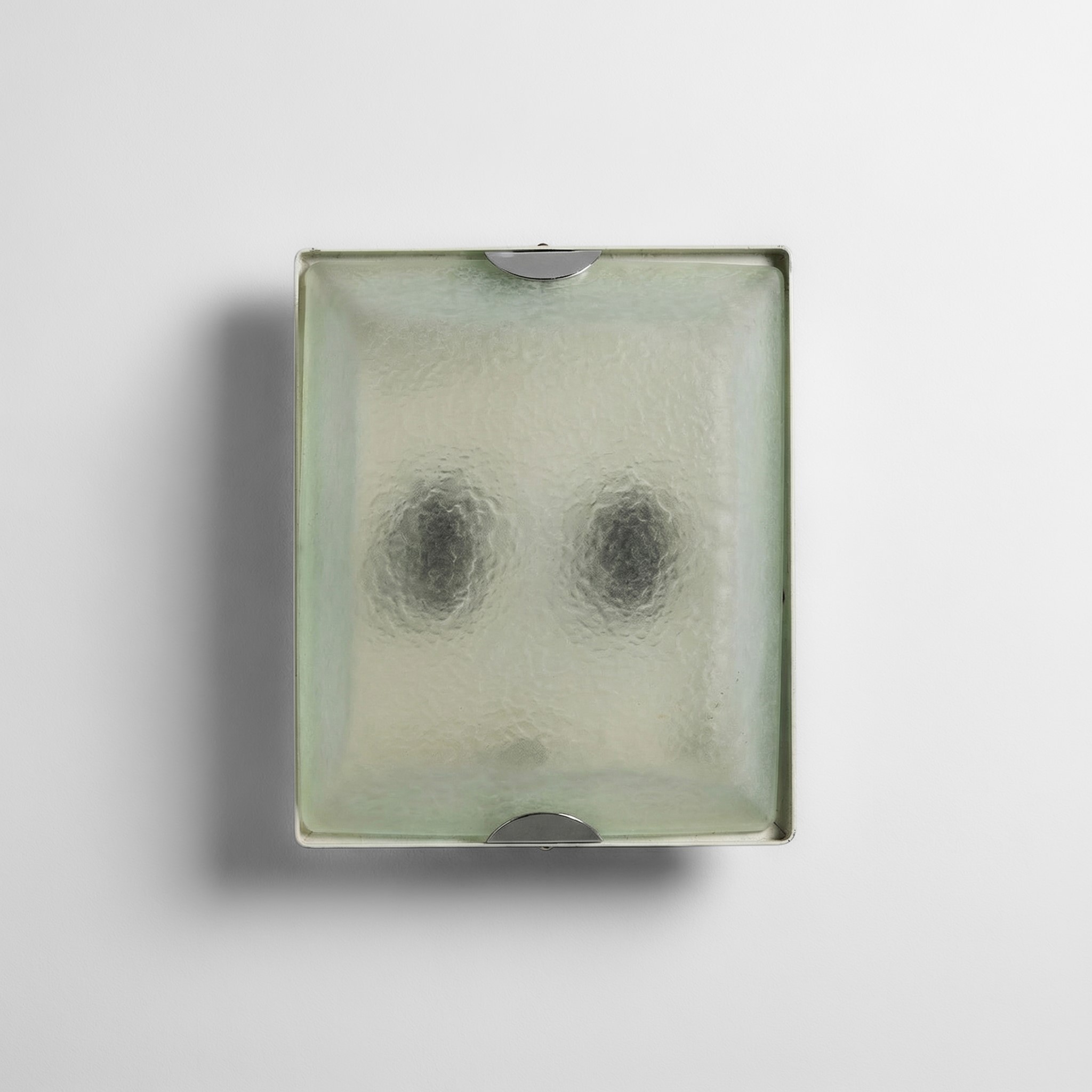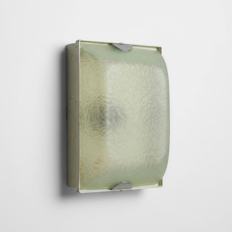 Struttura in metallo laccato e diffusore in vetro stampato ed acidato.