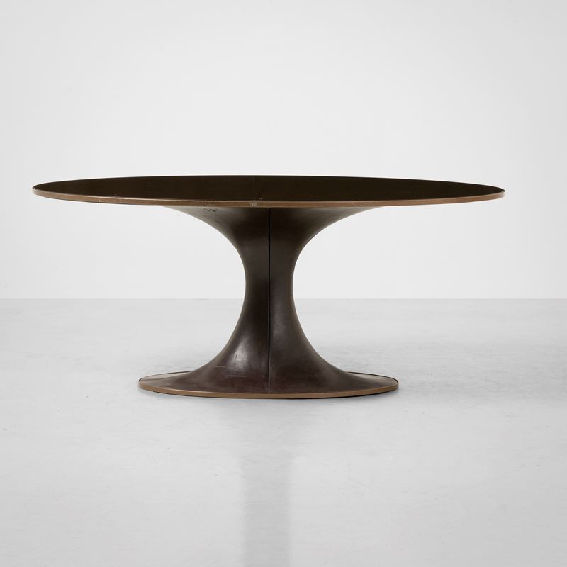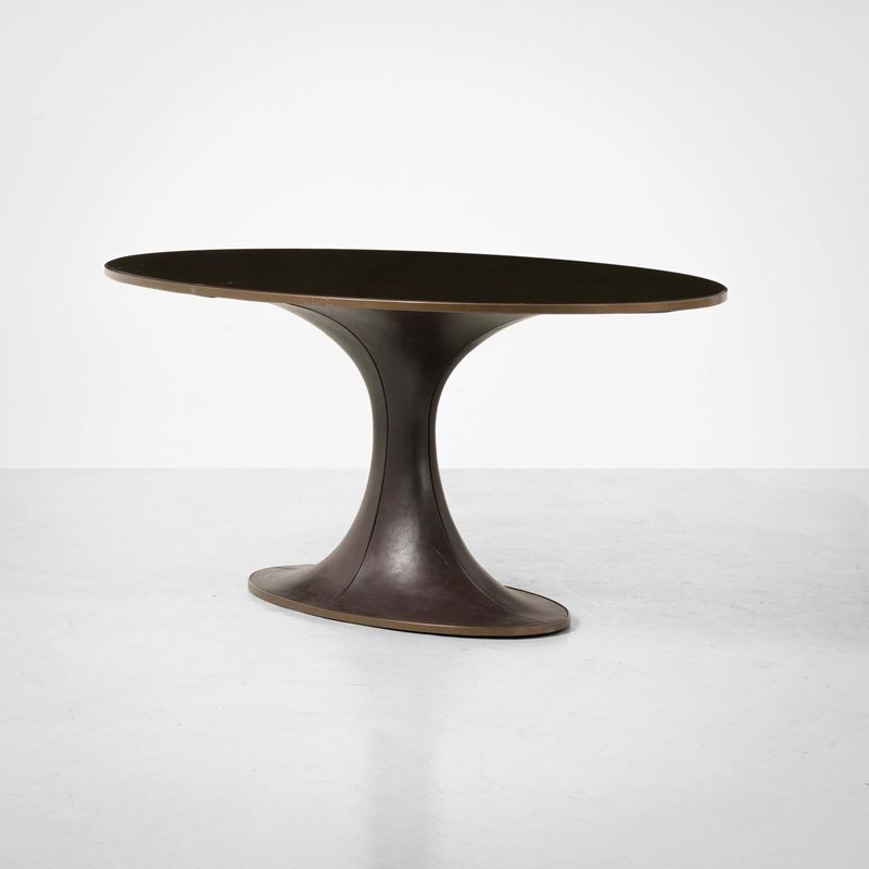 Struttura rivestita di cuoio e piano in vetro colorato. Dettagli in metallo laccato.