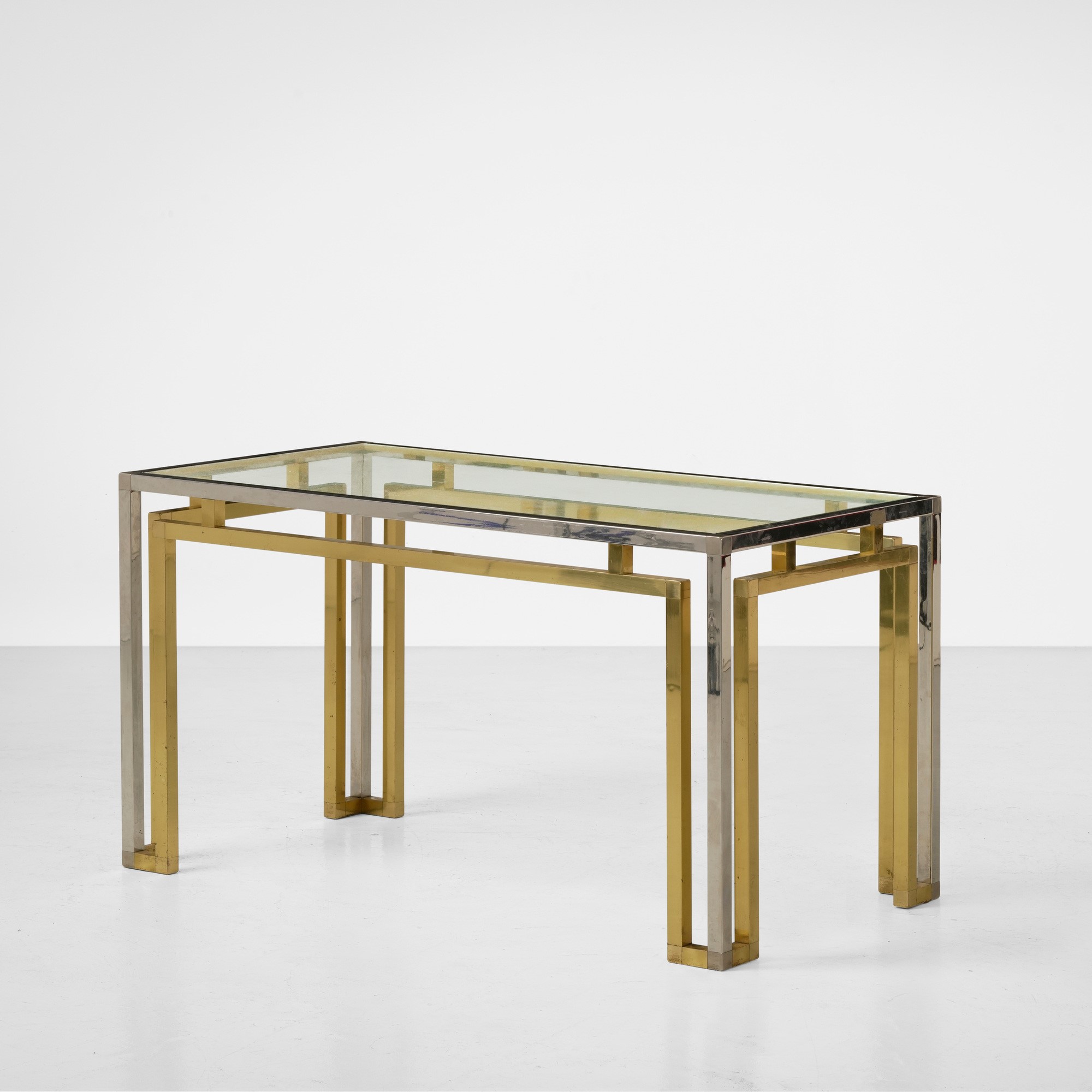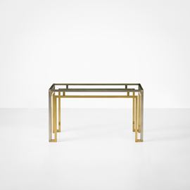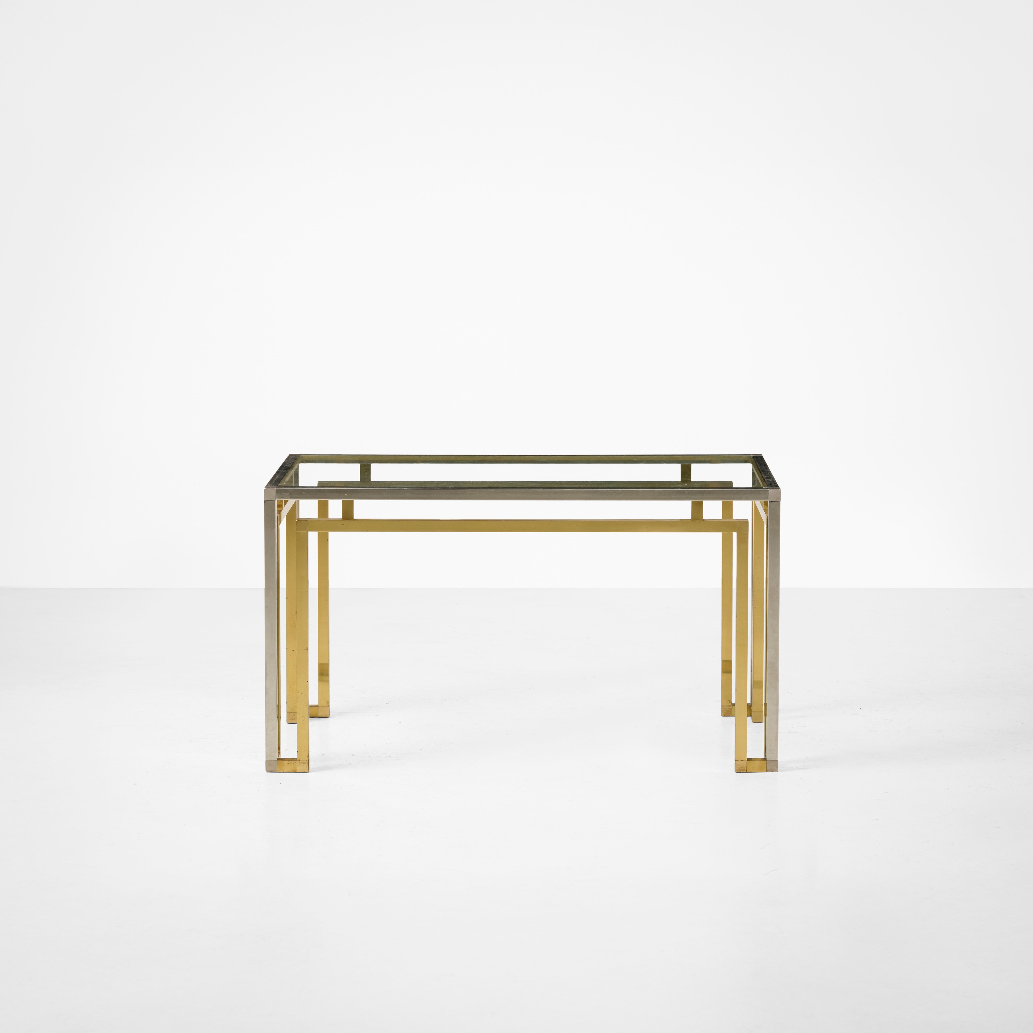 Struttura in metallo cromato e ottone, piano in cristallo molato.