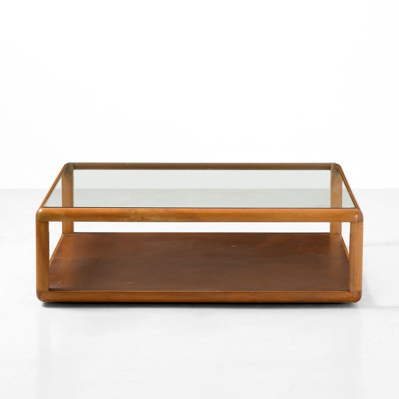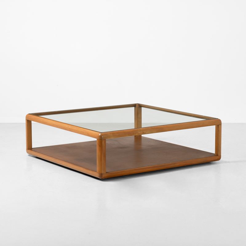 Struttura in legno e piani in cristallo molato. Rivestimento in pelle.