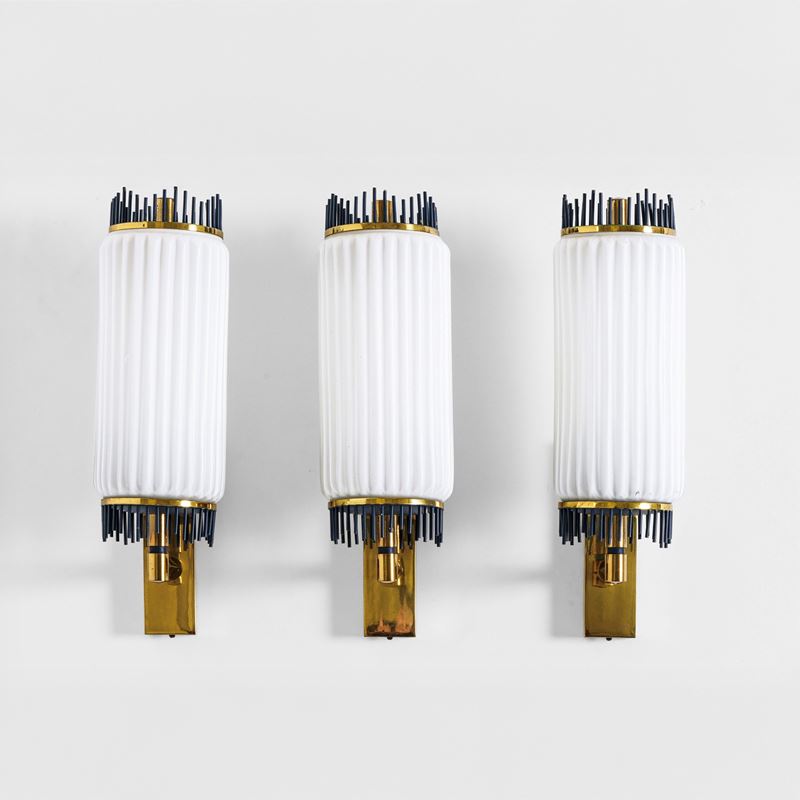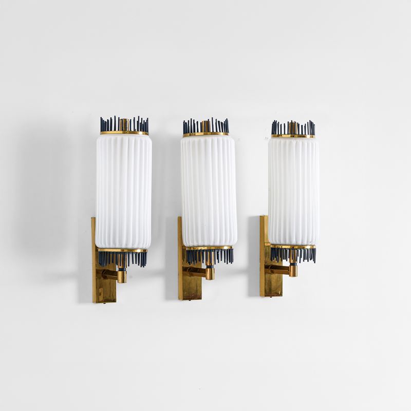 Struttura in ottone con dettagli in metallo laccato, diffusori in vetro opalino.