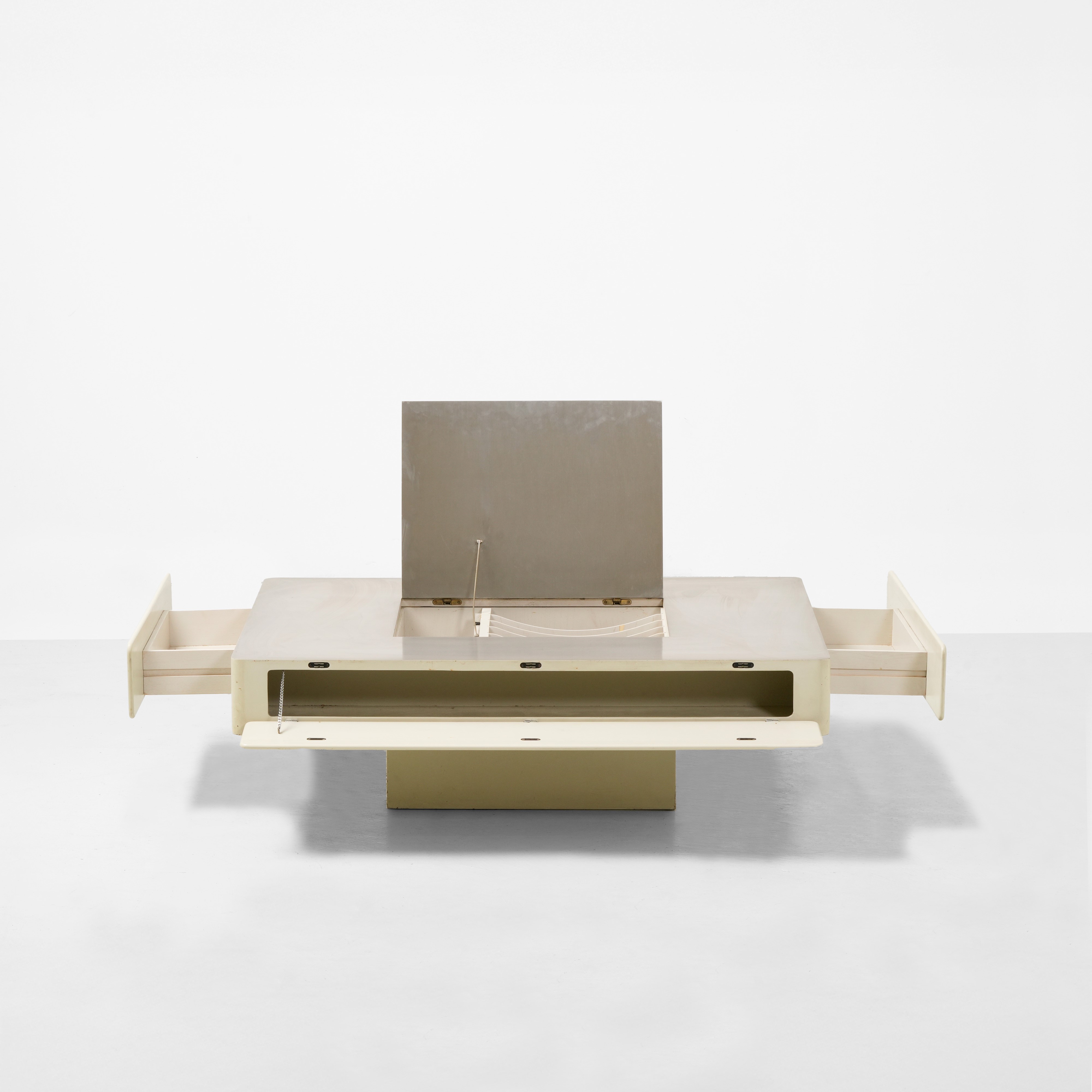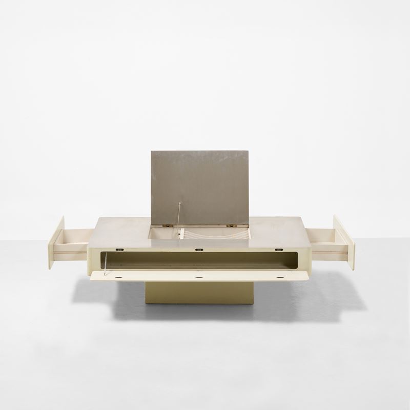 Struttura in legno laccato e rivestimento in acciaio.