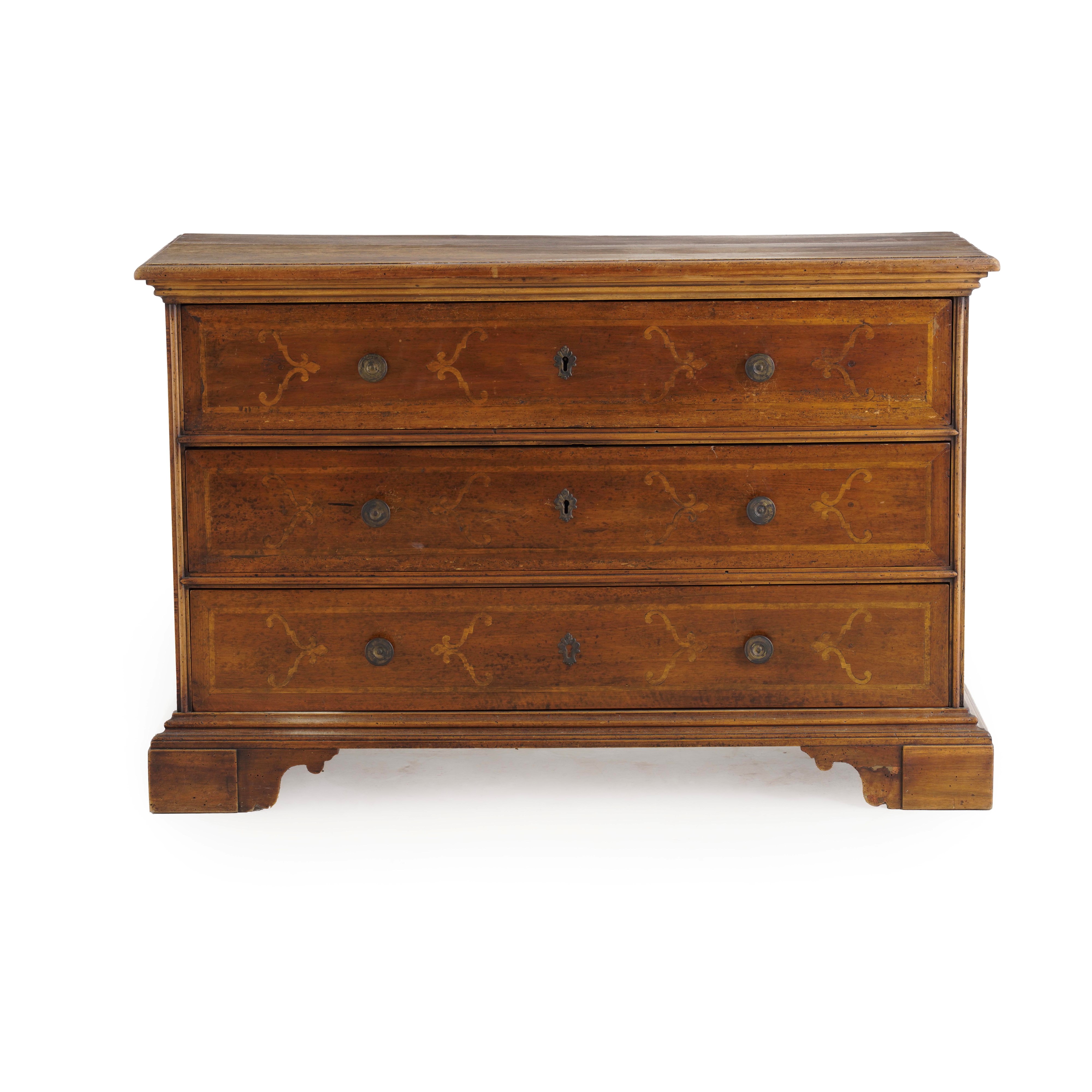 Fronte a tre cassetti, decoro a motivi fogliacei, piedi a ciabatta