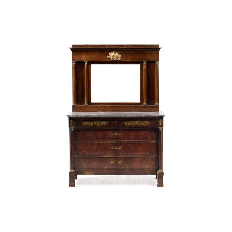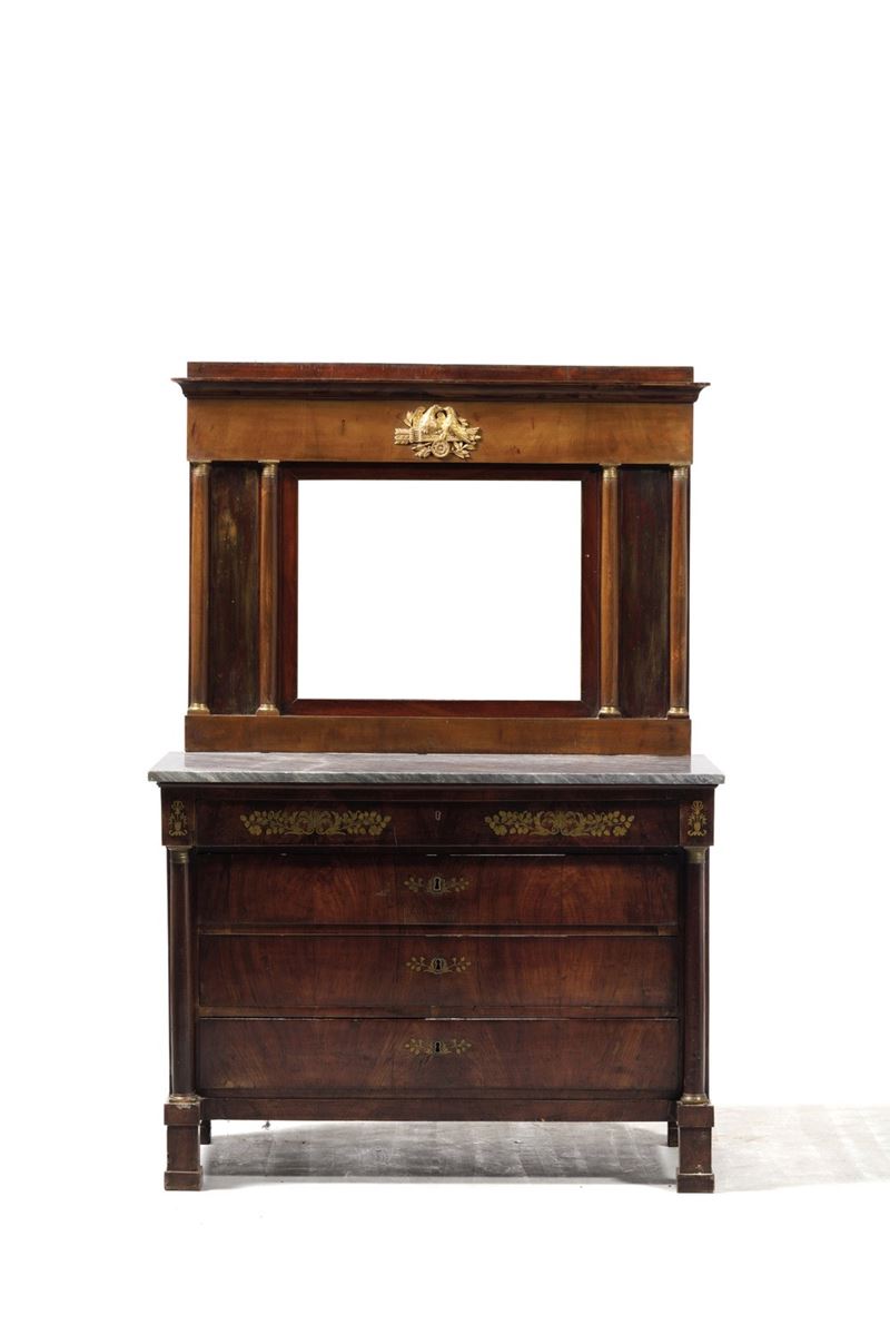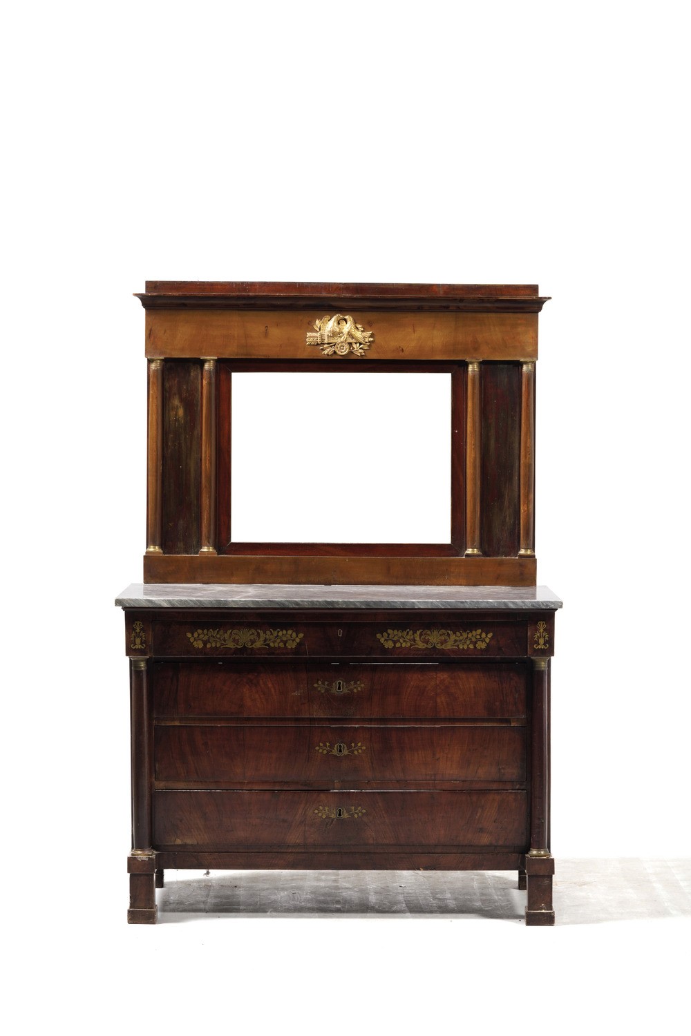 Coppia comò Impero con specchiere in legno lastronato ed intarsiato. XIX secolo