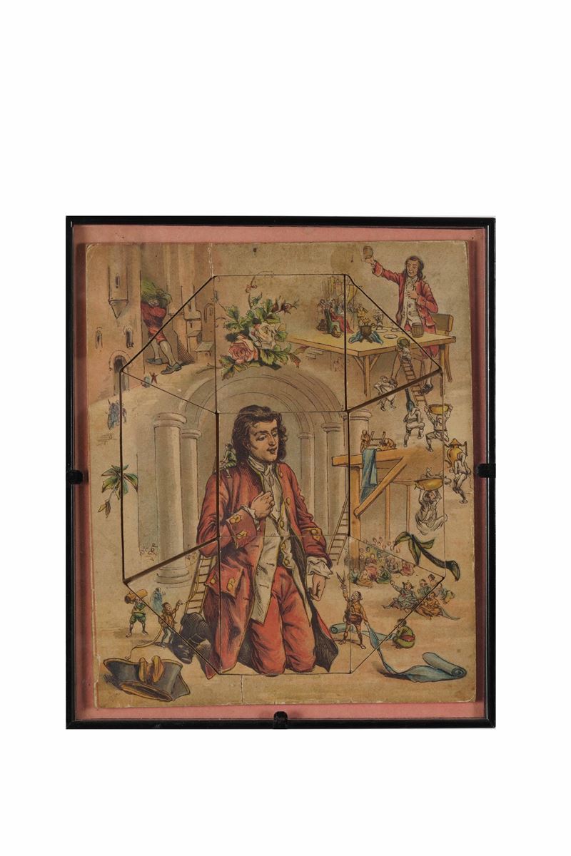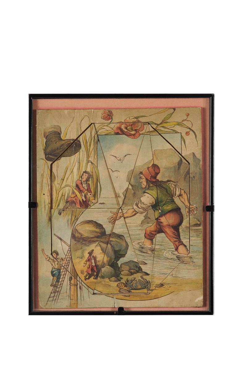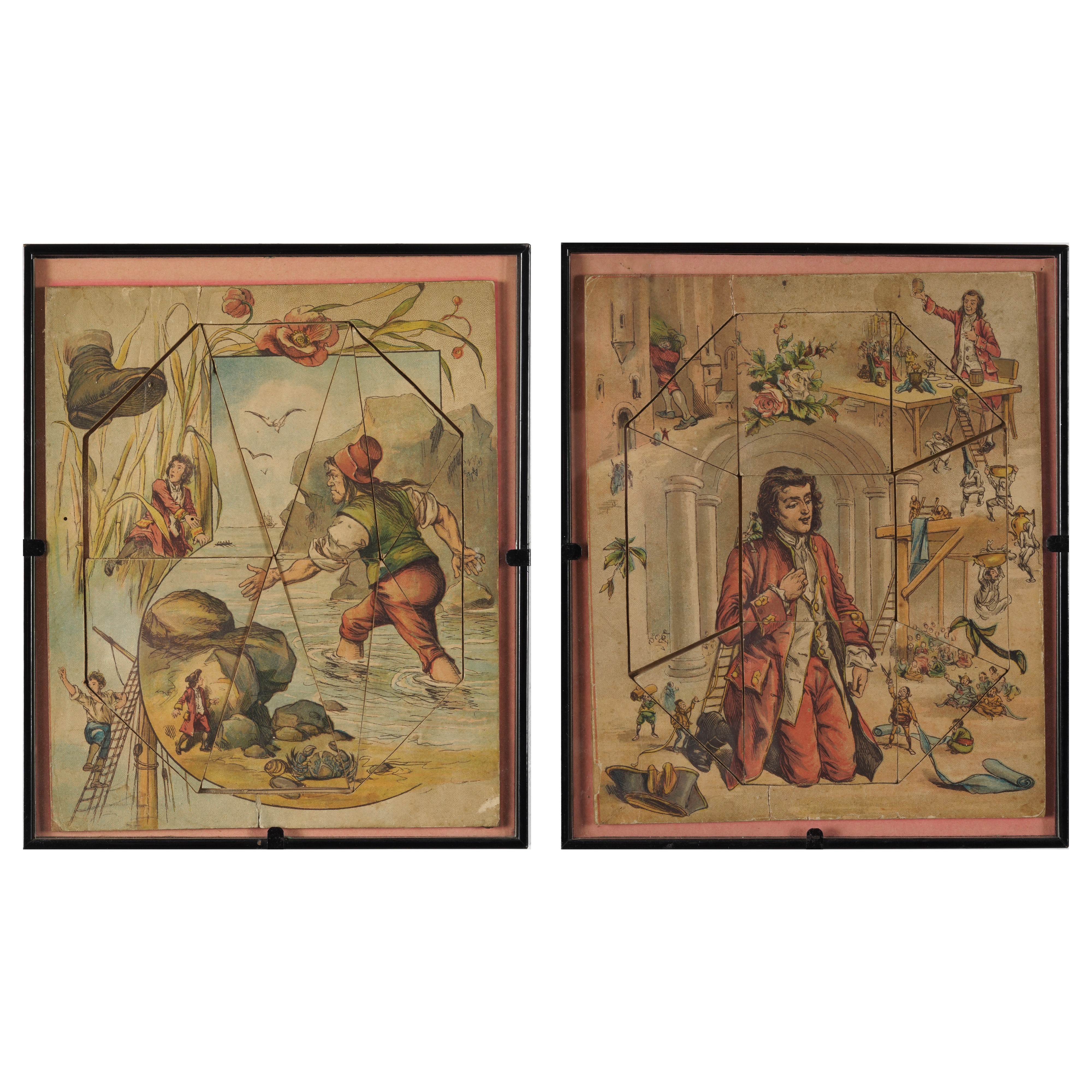 Due stampe a colori a "puzzle" tratte dai viaggi di Gulliver. Francia XIX-XX secolo
