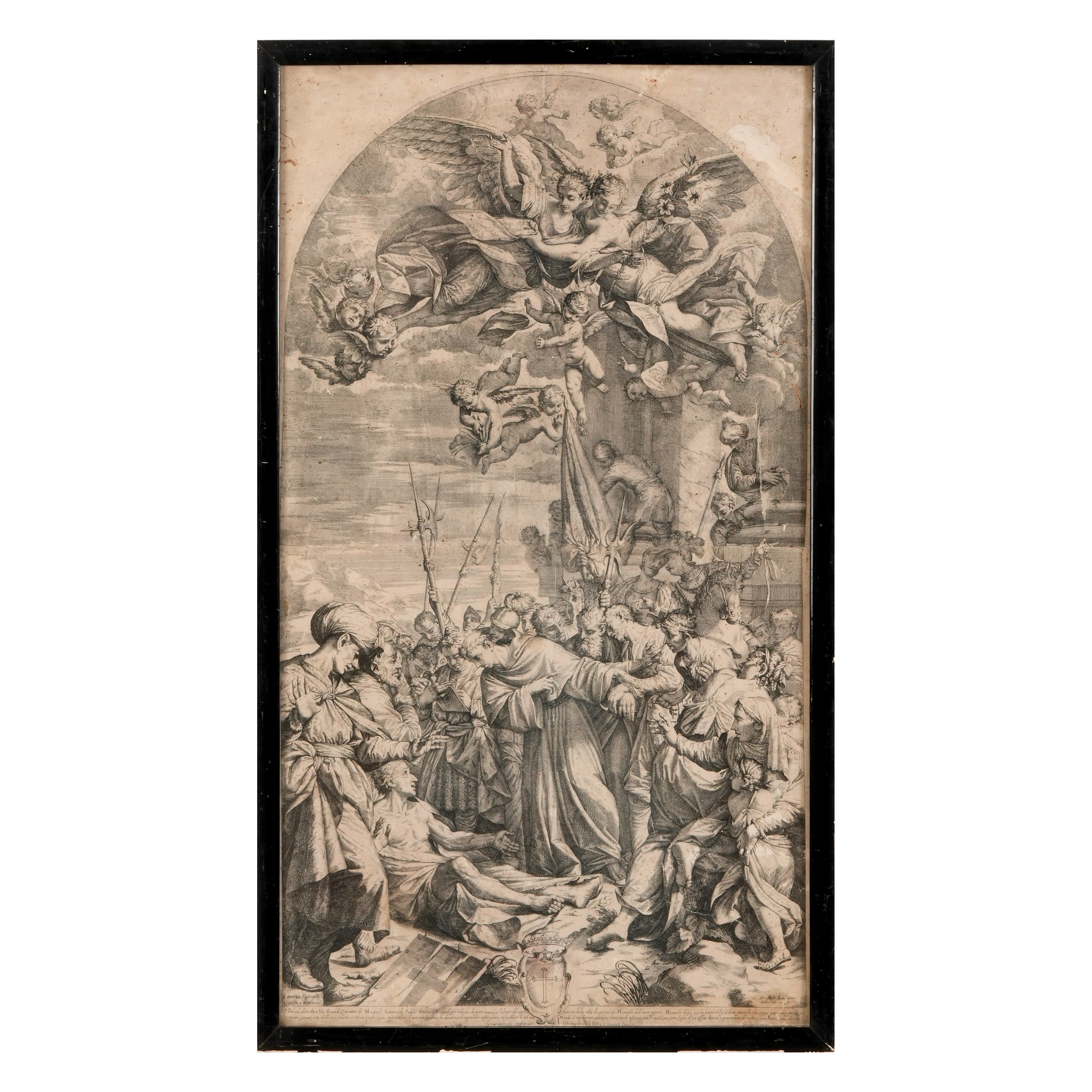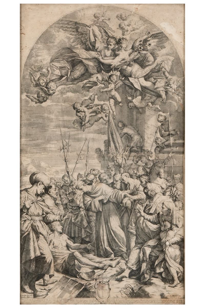 Incisione su rame. Riproduzione della pala realizzata dal Pasinelli per la Chiesa di San Petronio a Bologna. Entro cornice. Buon esemplare un po' brunito. Dimensioni: 50x90 cm