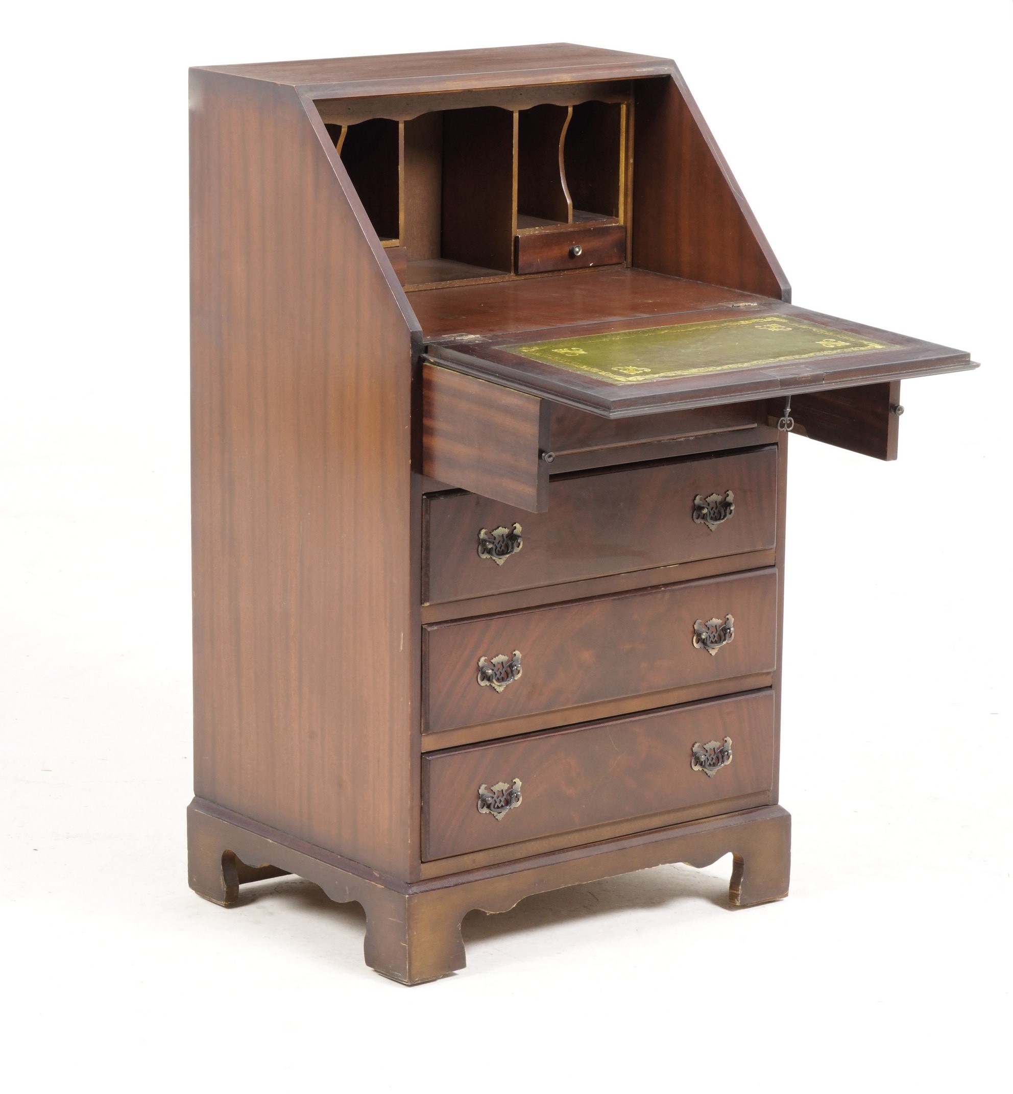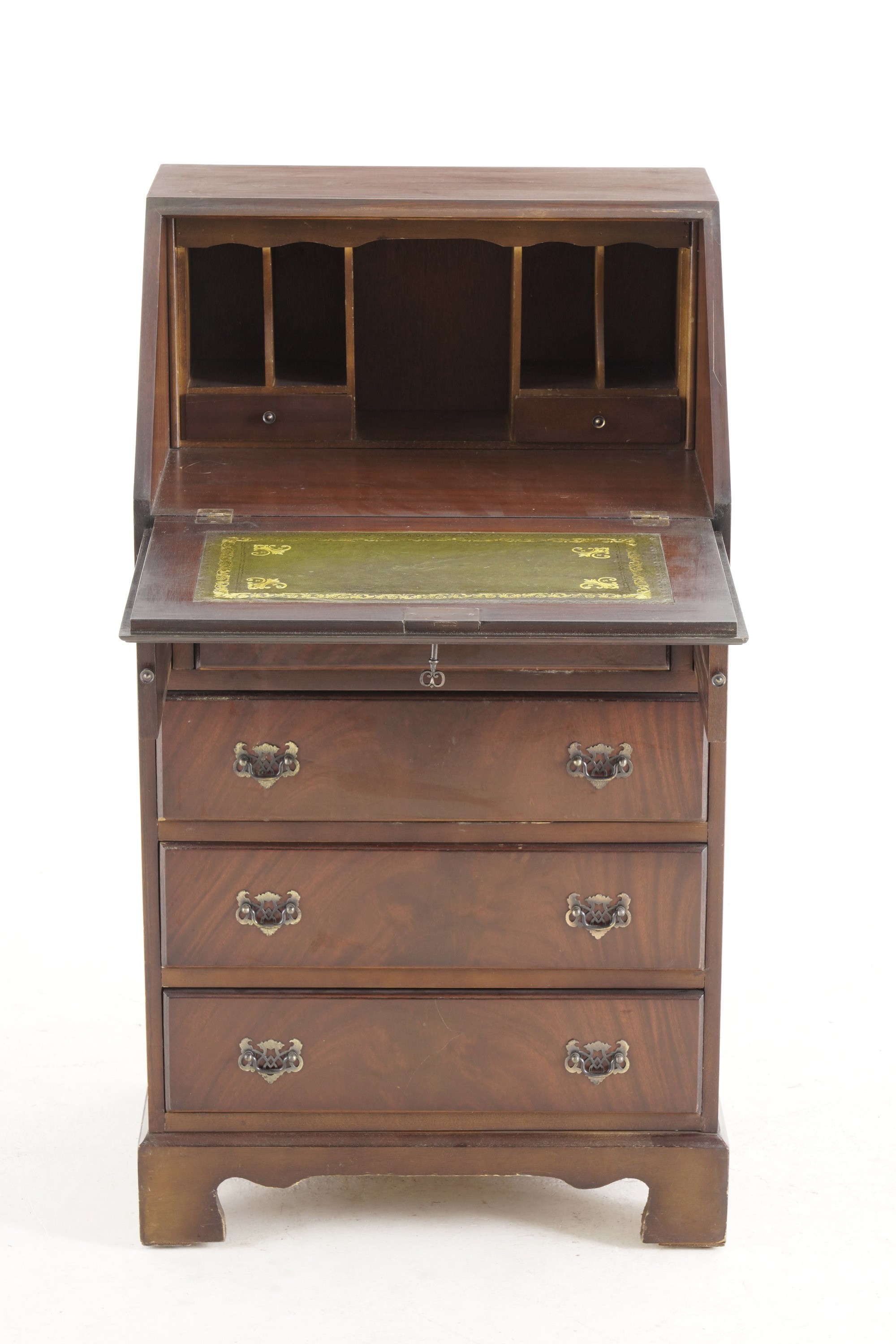 Fronte a quattro cassetti e ribalta che cela cassettini e scomparti e piano foderato in cuoio