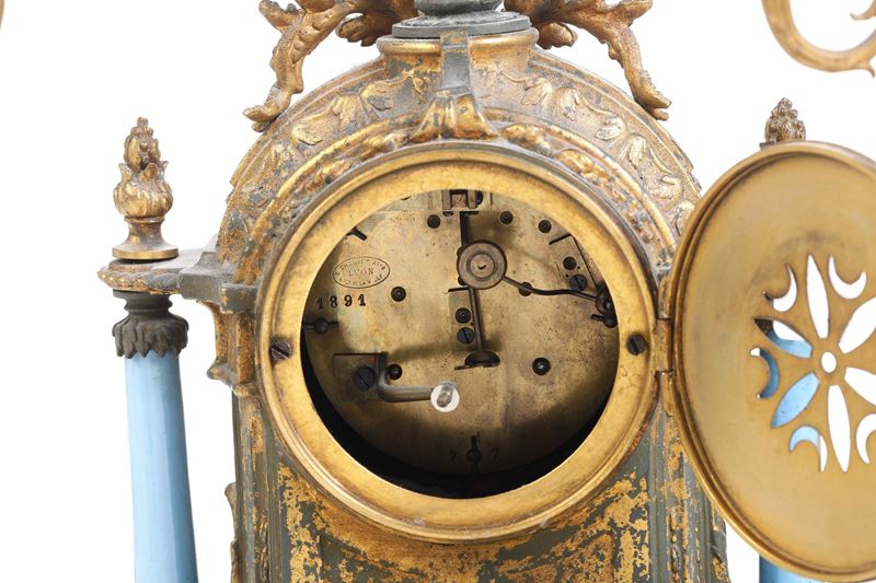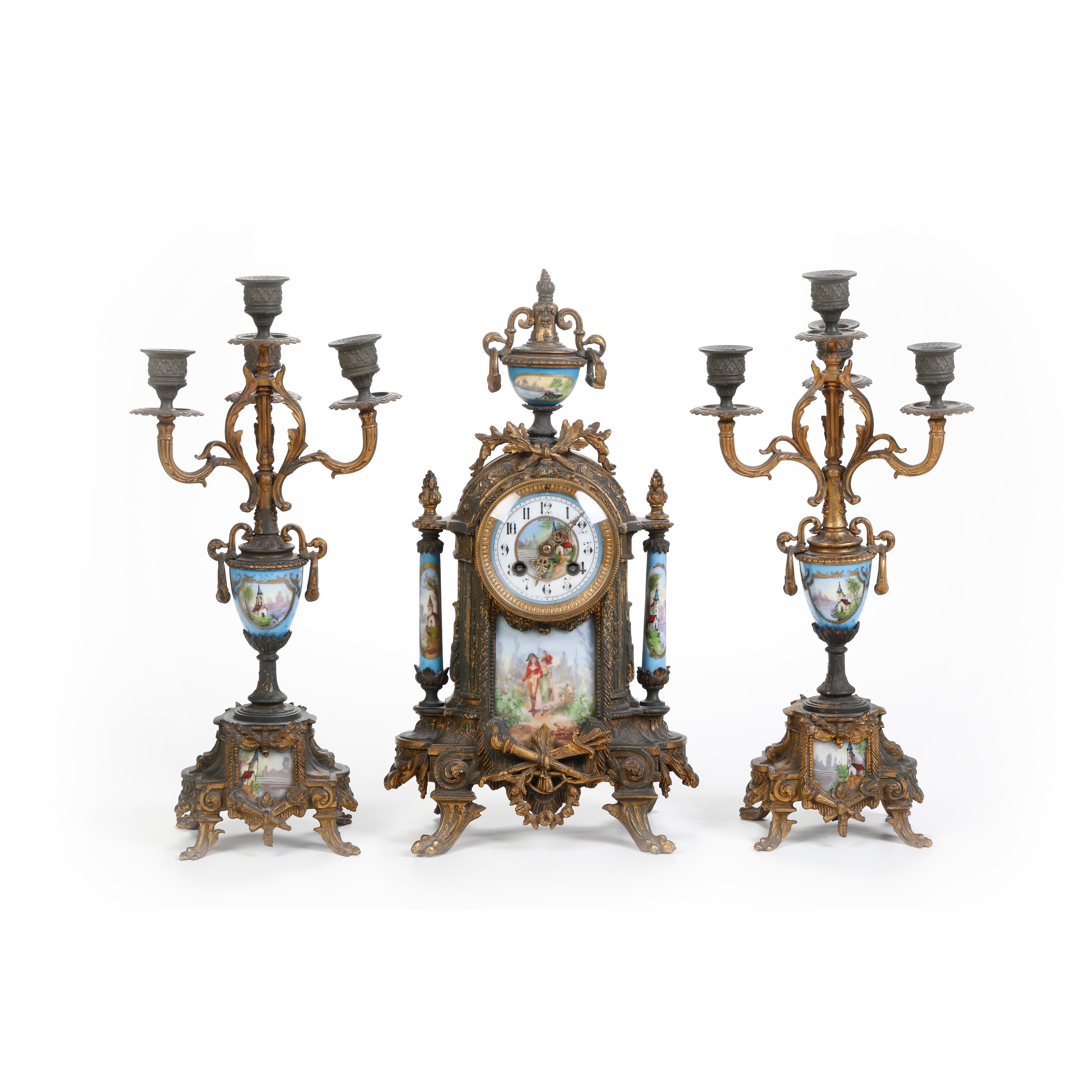 Trittico da camino in bronzo e porcellana dipinta composto da orologio e coppia di candelabri. Francia XIX secolo