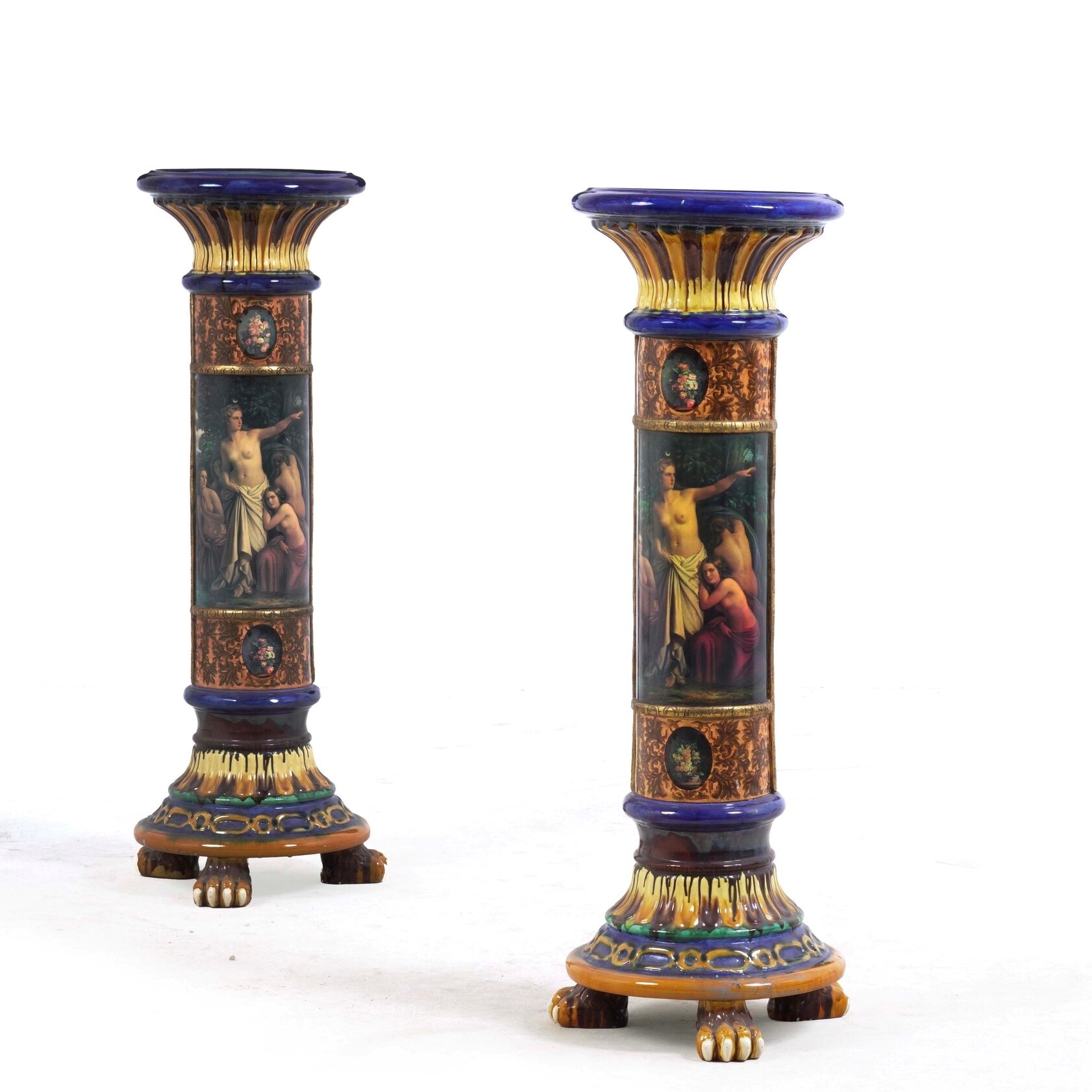 Coppia di piedistalli in ceramica policroma. XX secolo