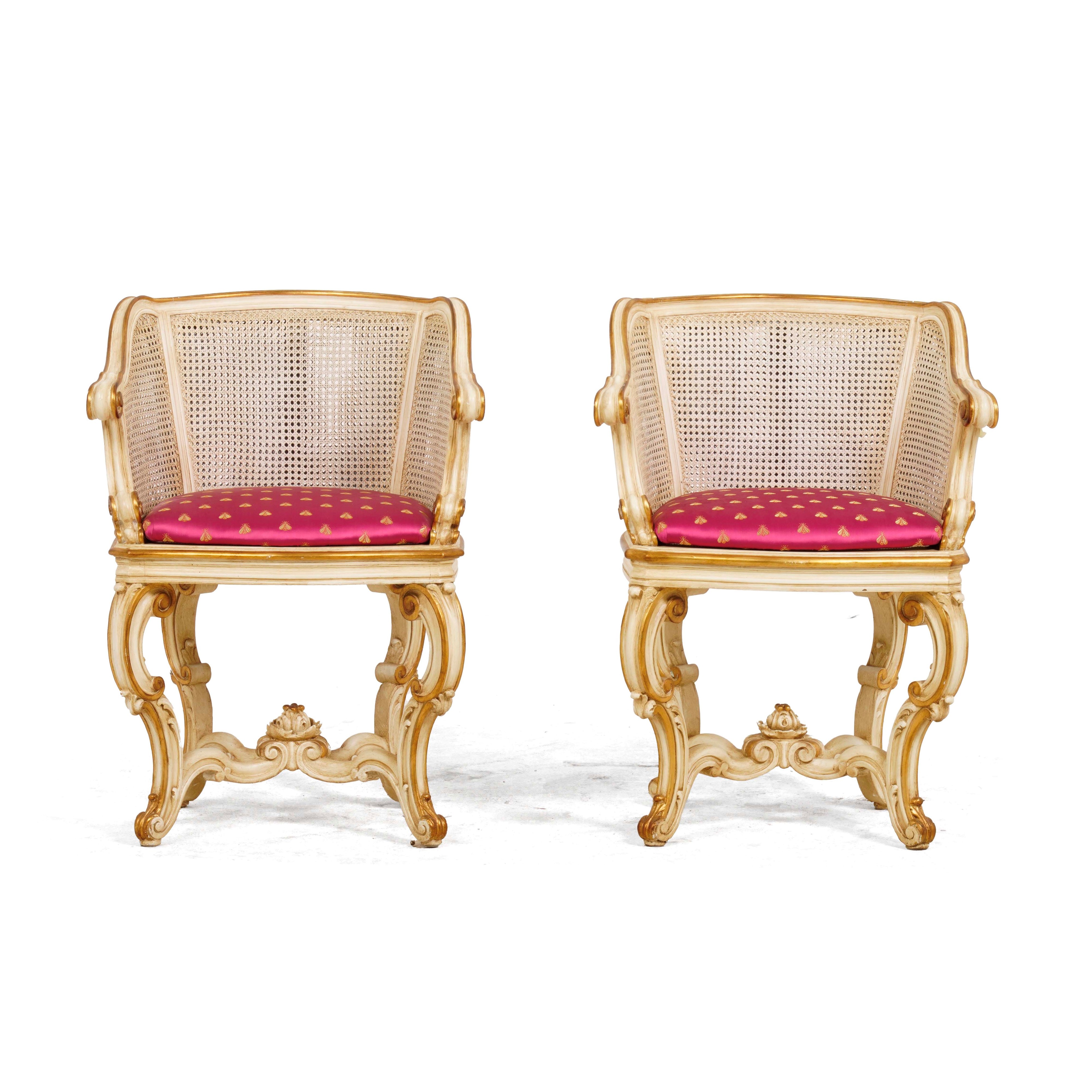 Coppia di poltrone in legno intagliato, dipinto e dorato. XX secolo