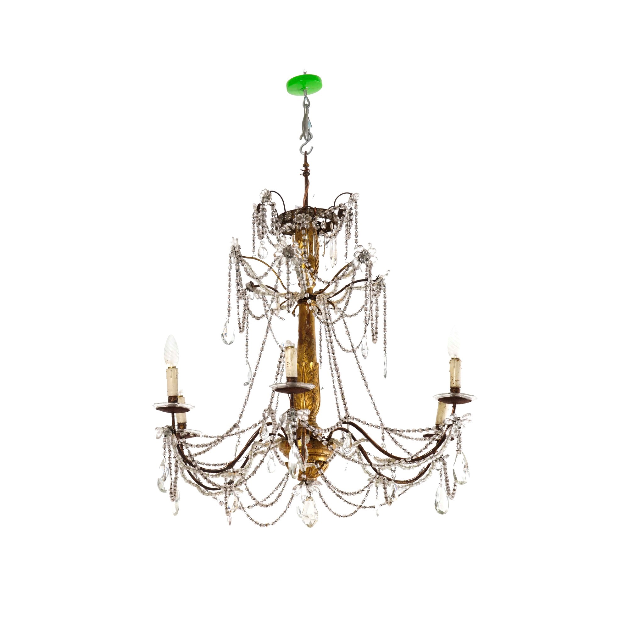 Lampadario in legno dorato e cristalli