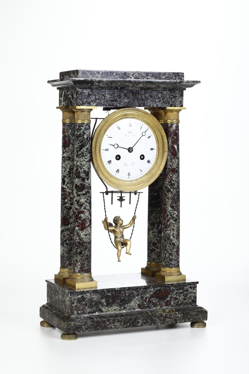 Montanti a colonna con basi e capitelli in bronzo dorato, cassa tonda in bronzo dorati con quadrante in smalto con numeri arabi firmata "Ledure - Bronziere a Paris". Appeso sotto amorino in bronzo dorato su un'altalena