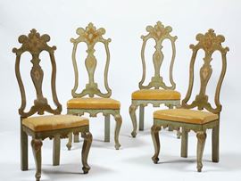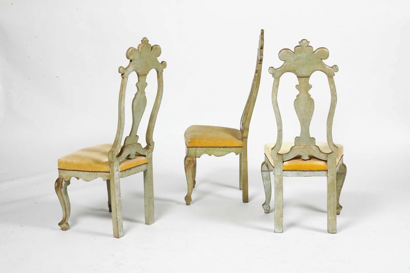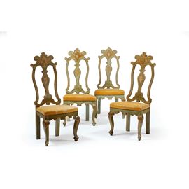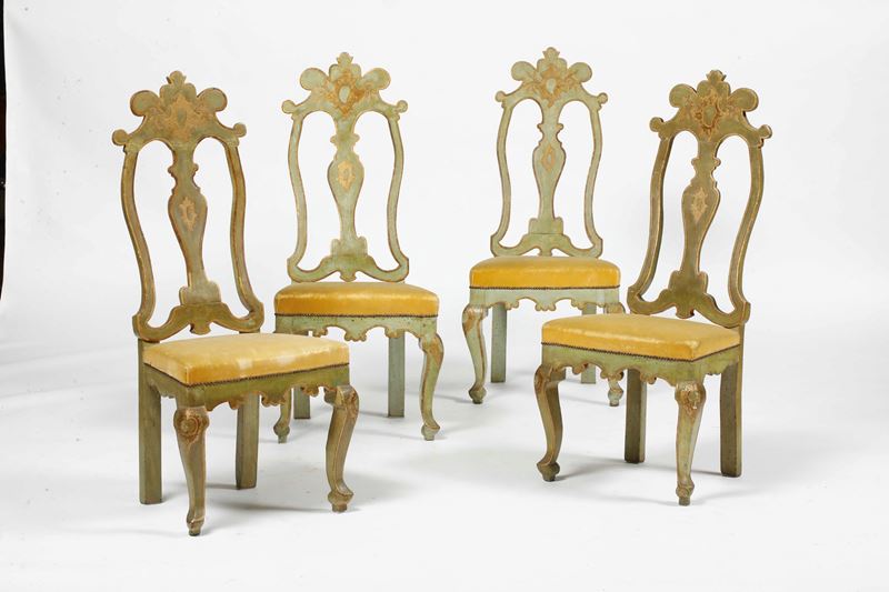 Quattro sedie in legno intagliato e dipinto. XVIII secolo