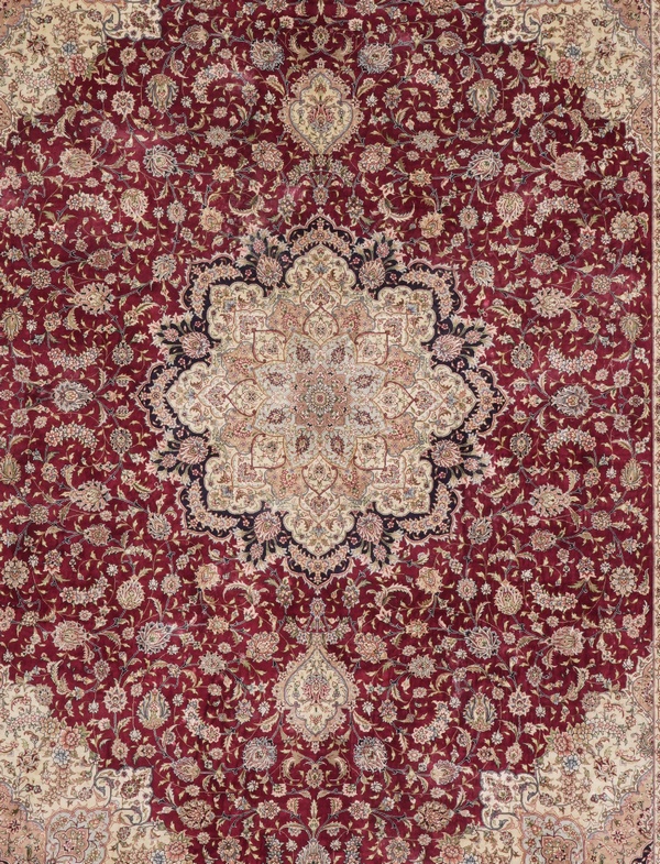 sul campo rosso scuro spicca un medaglione beige e viola, particolare il decoro della bordura marrone