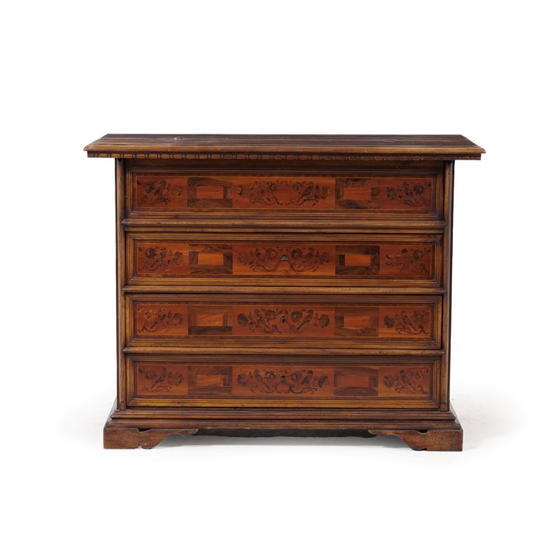 Cassettone lastronato ed intarsiato a motivi floreali. XVIII secolo