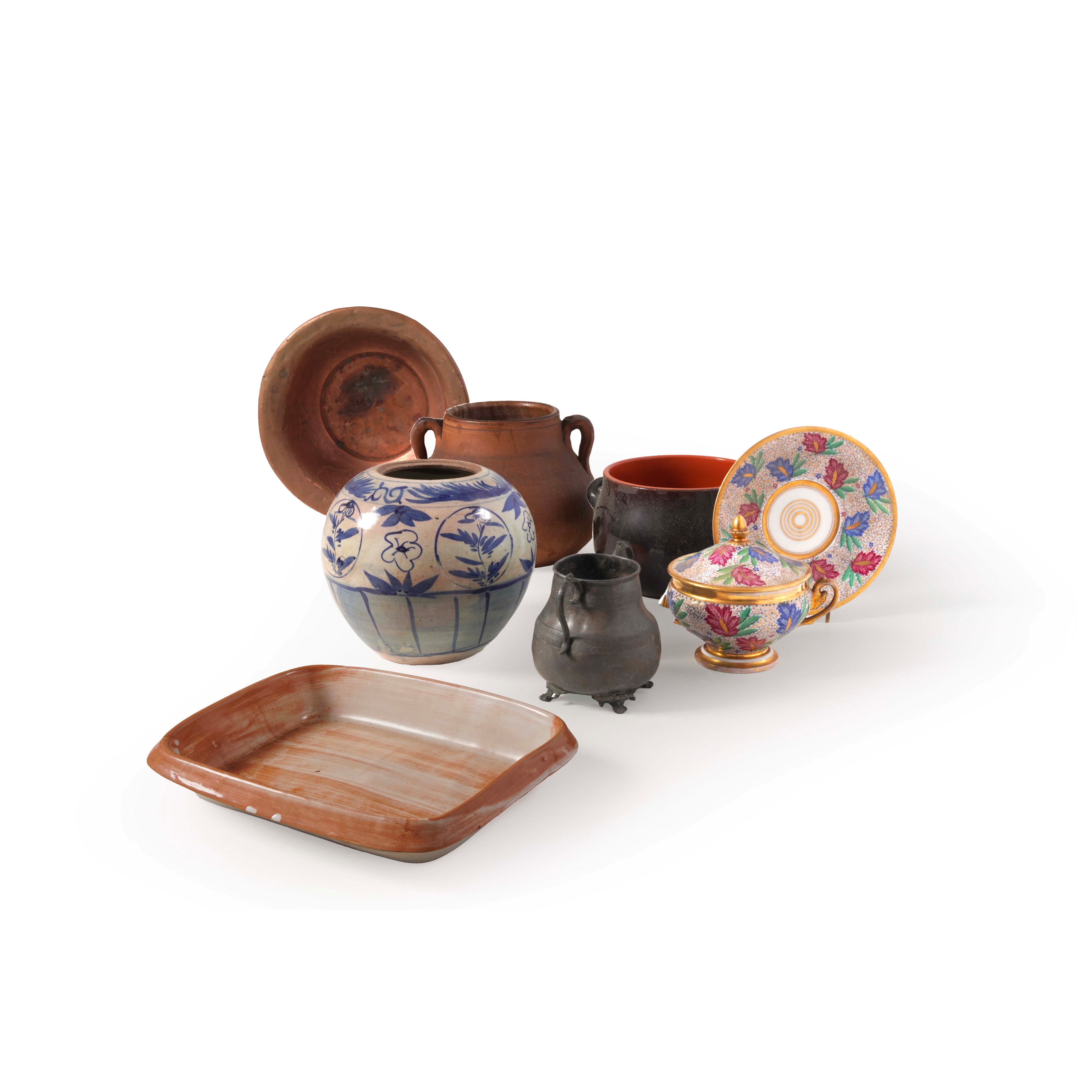 Tre vasi, di cui uno decoro monocromo floreale, una teglia una zuccheriera con coperchio e piattino decorata a fiori policromi con profili dorati. Si aggiunge nel lotto un vaso biansato in metallo