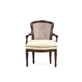 Seduta imbottita e schienale in cannetè, gambe troncoconiche rastremate, braccioli mossi