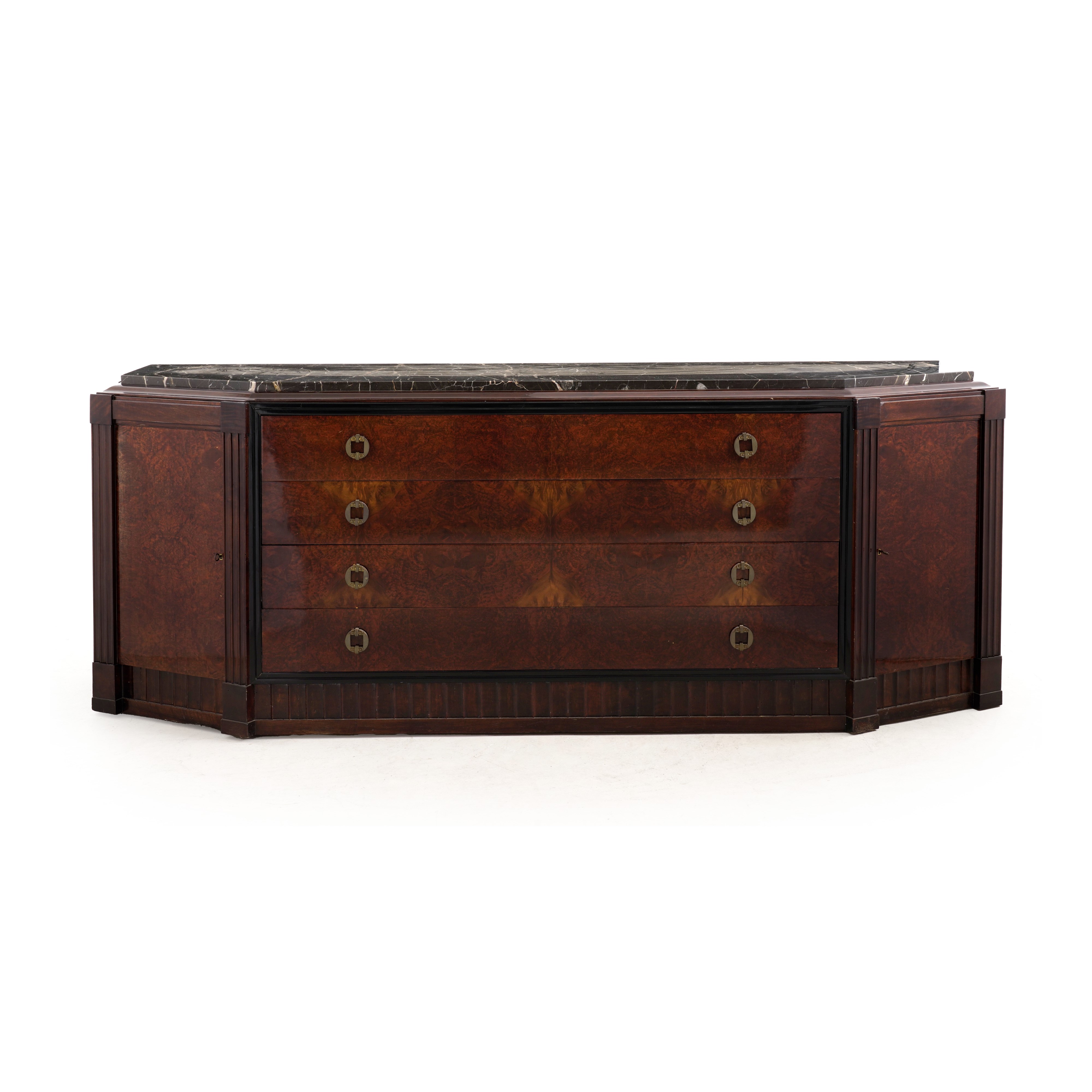 Fronte a quattro cassetti e due ante, profili ebanizzati, montanti a lesena, piano in marmo