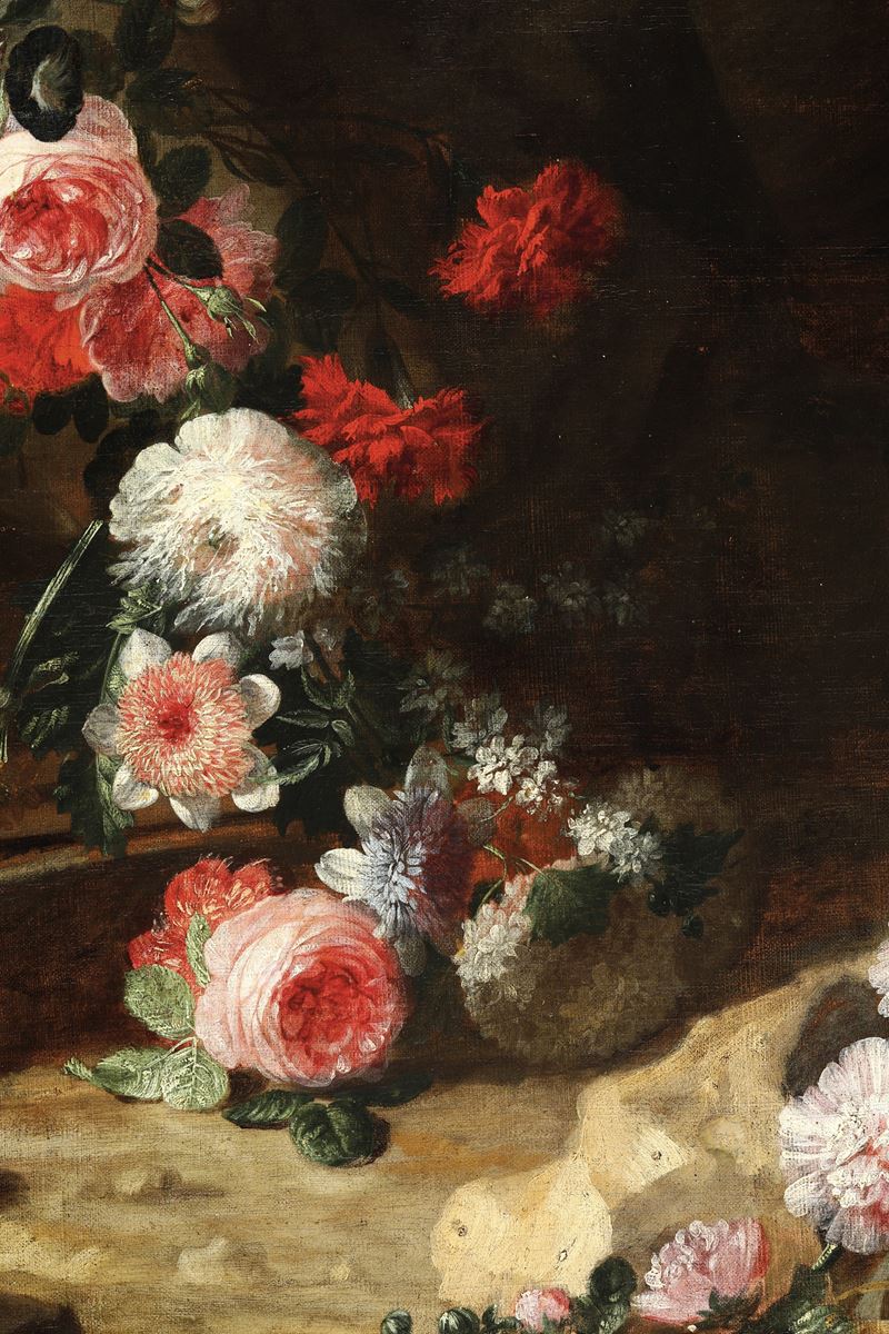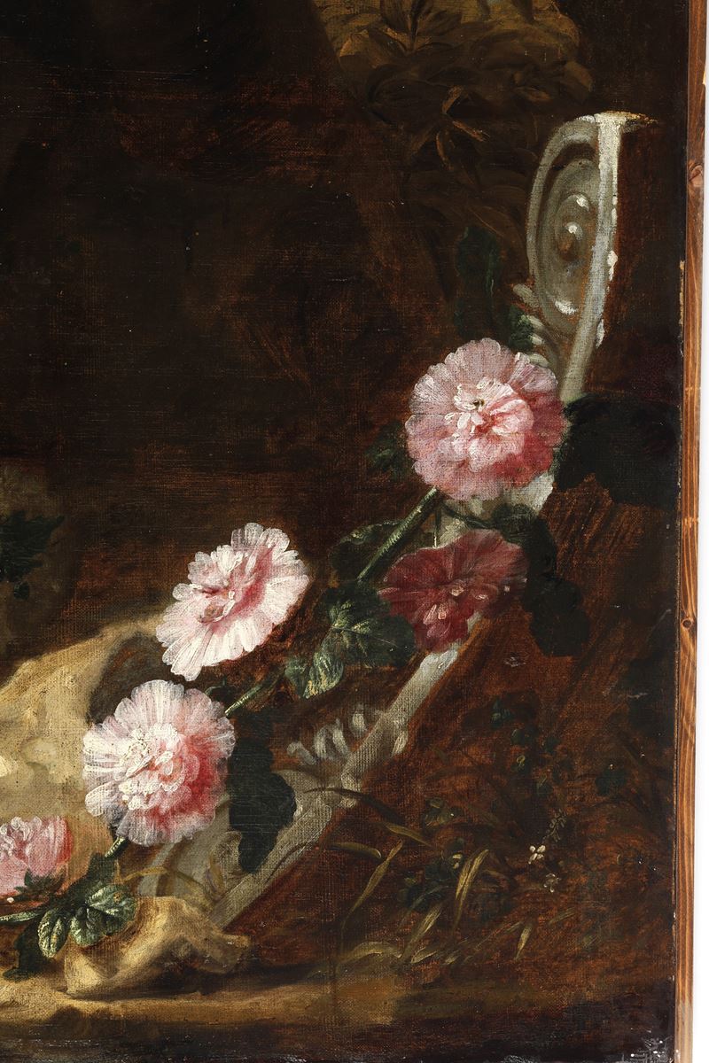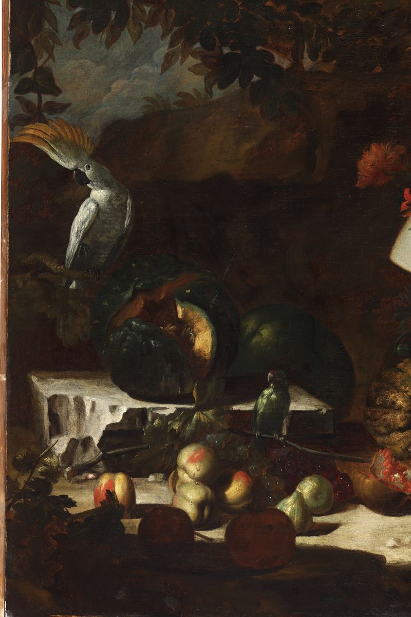Artista fiammingo attivo a Roma nel XVII secolo Natura morta entro paesaggi con busto femminile, fiori, frutti e pappagal [..]