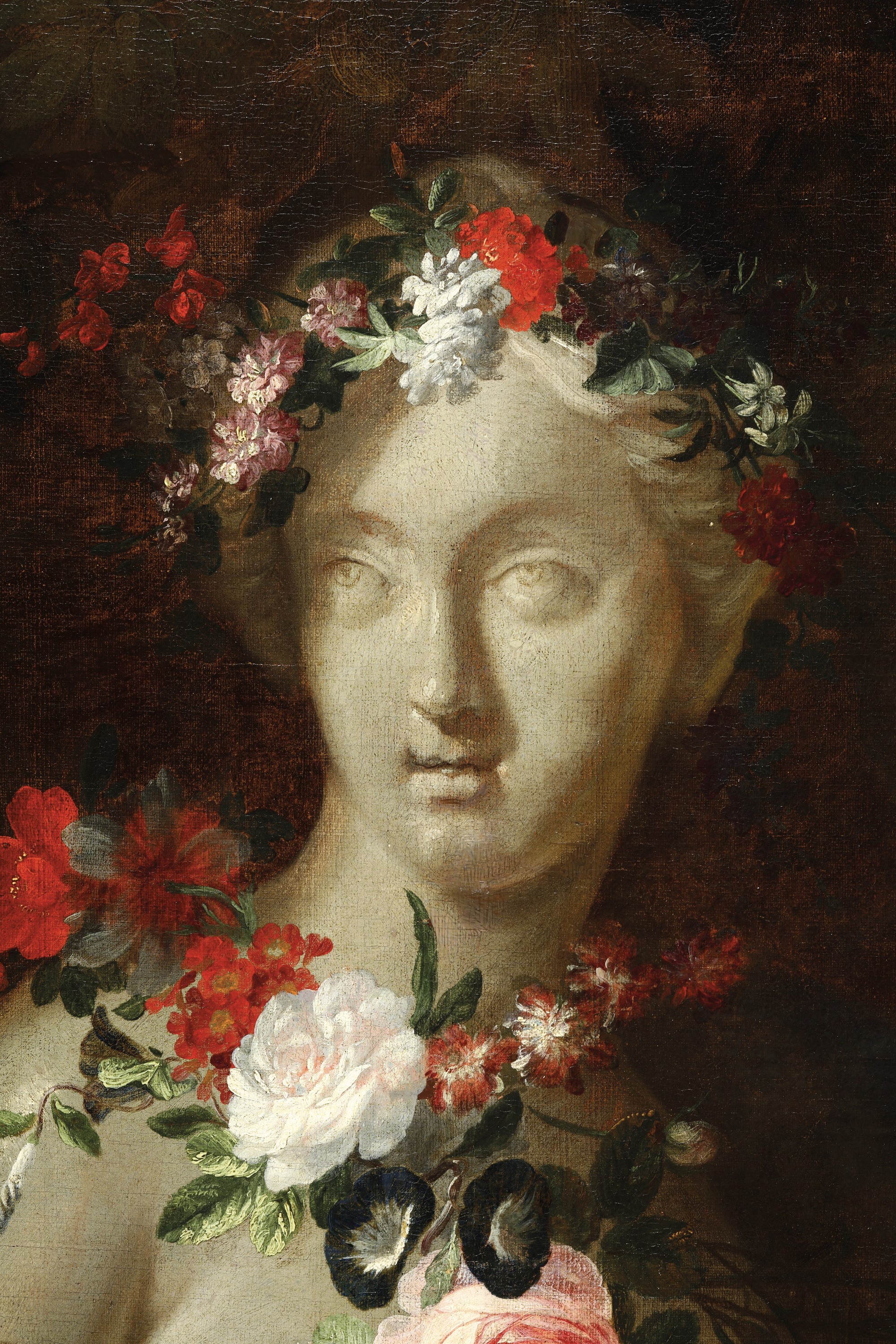 Artista fiammingo attivo a Roma nel XVII secolo Natura morta entro paesaggi con busto femminile, fiori, frutti e pappagallino