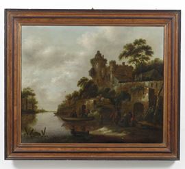 Scuola fiamminga del XVIII secolo Paesaggio fluviale con villaggio, pescatori e contadini