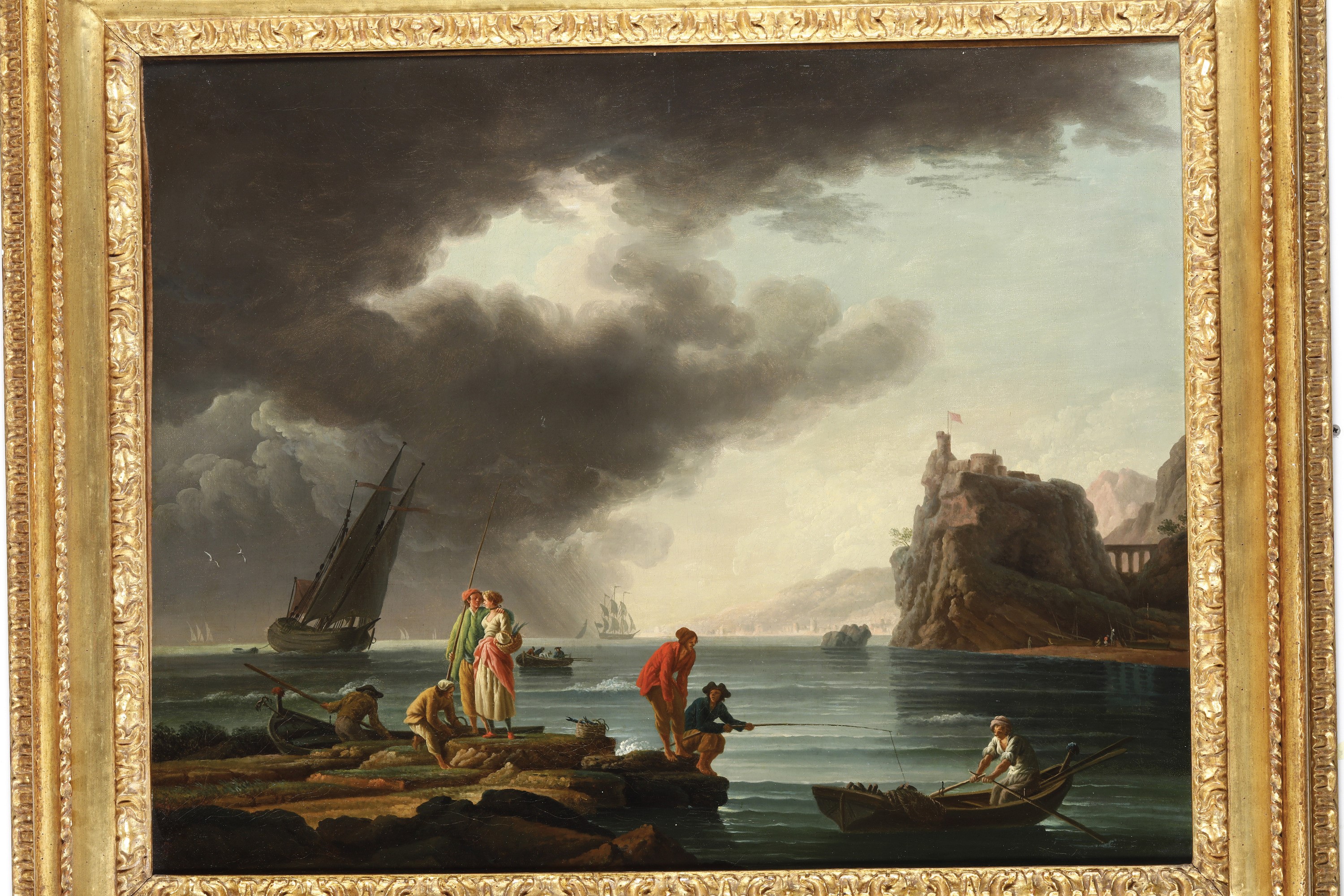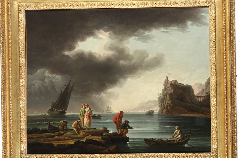 Scuola francese del XVIII secolo Veduta costiera con pescatori