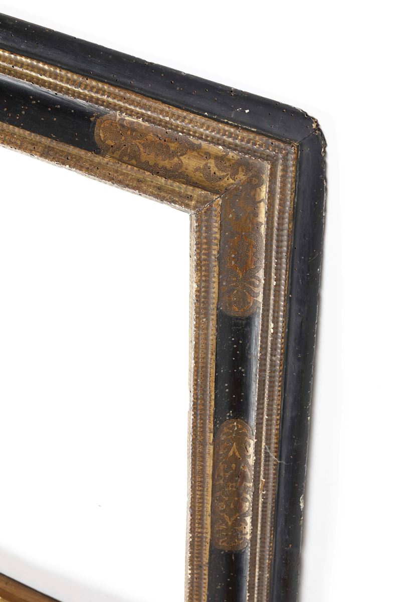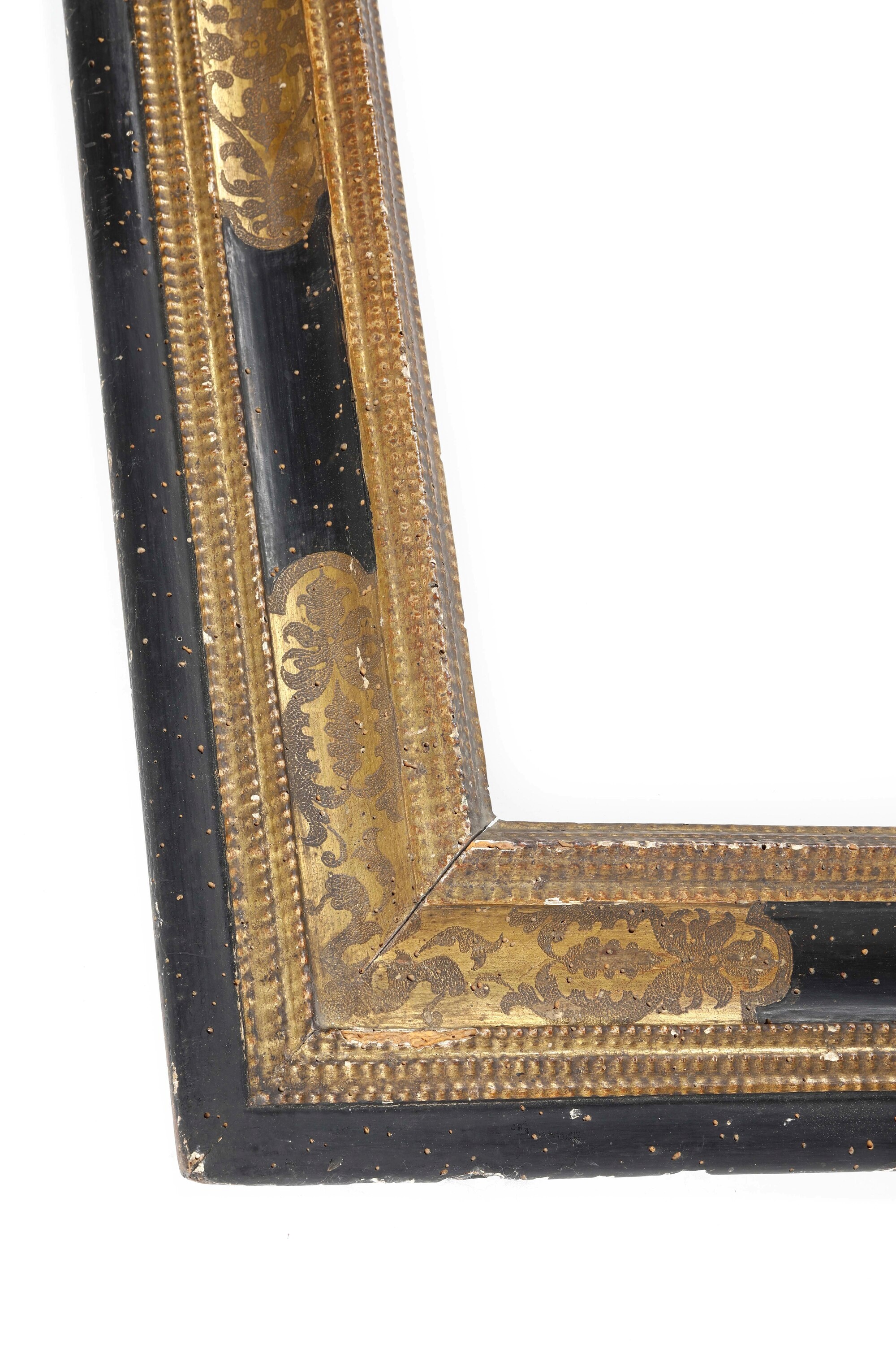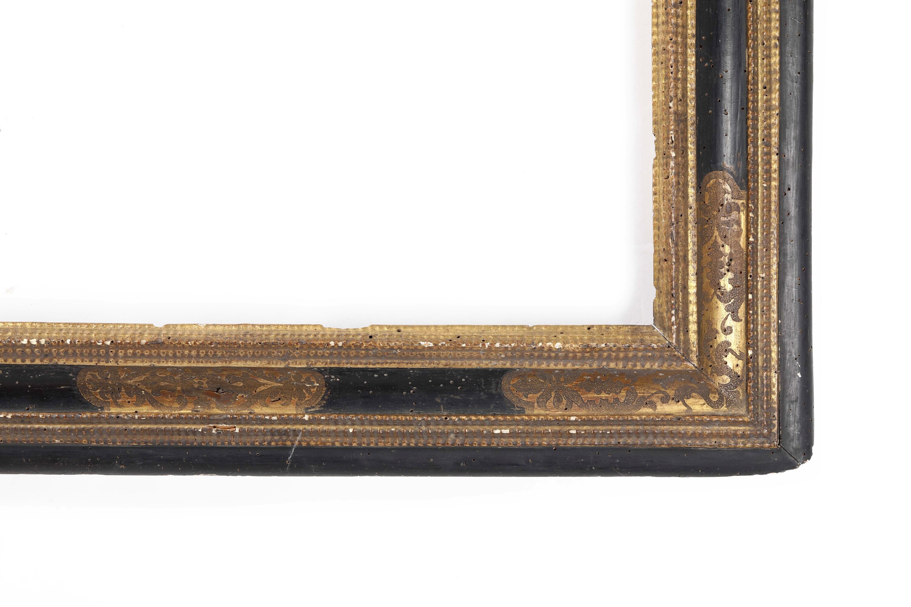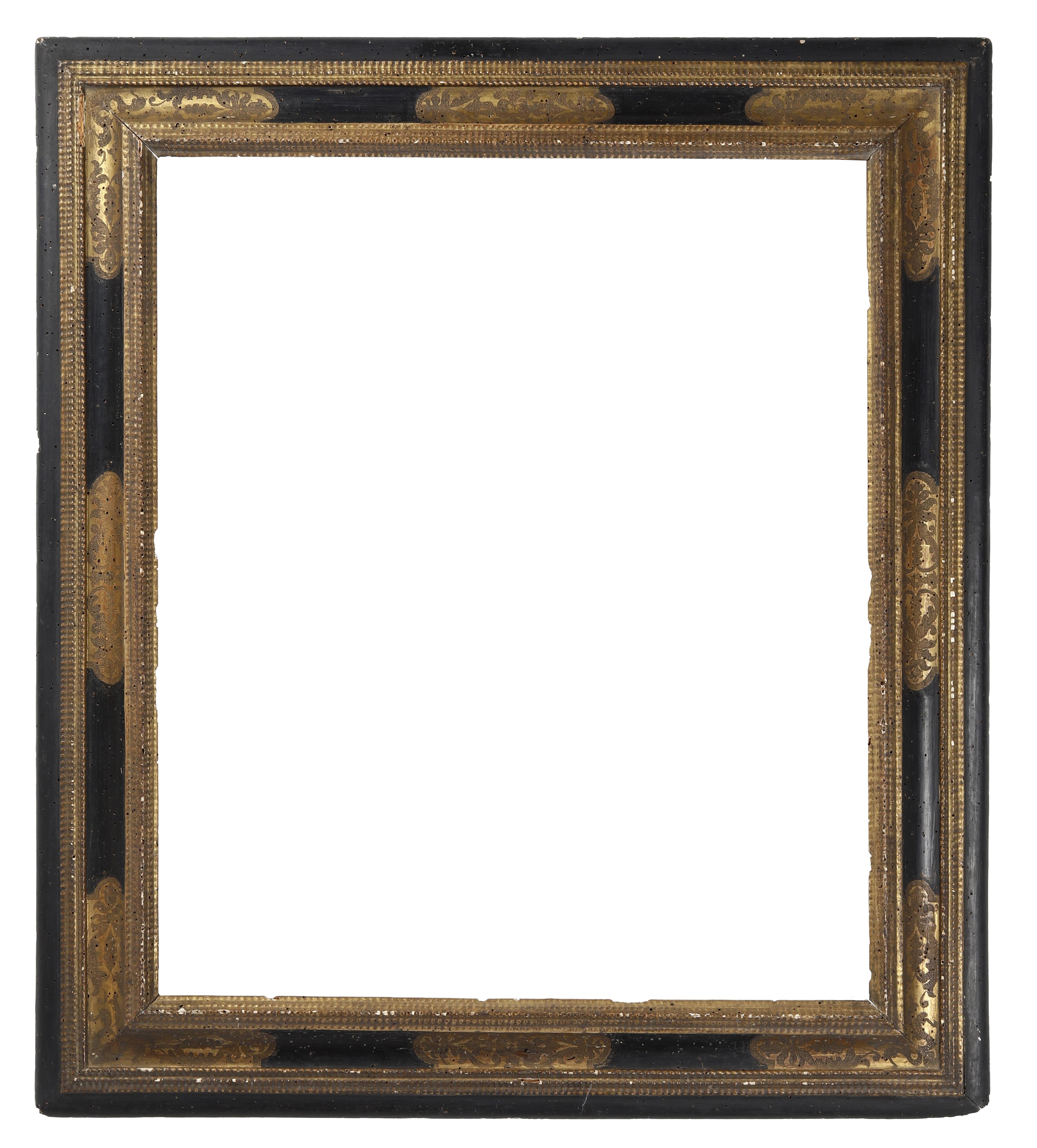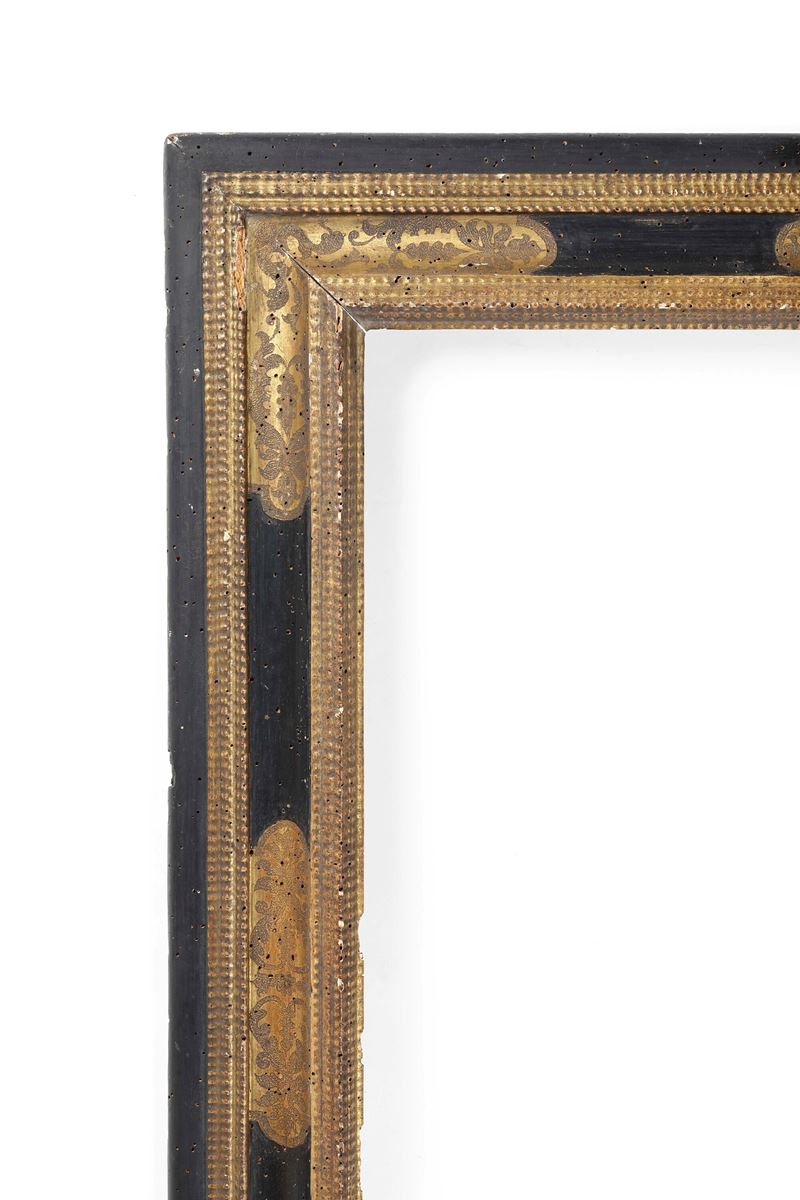 battuta dorata a più ordini di intaglio, fascia ebanizzata con decori agli angoli e ai centri di ramages vegetali su fondo bulinato
