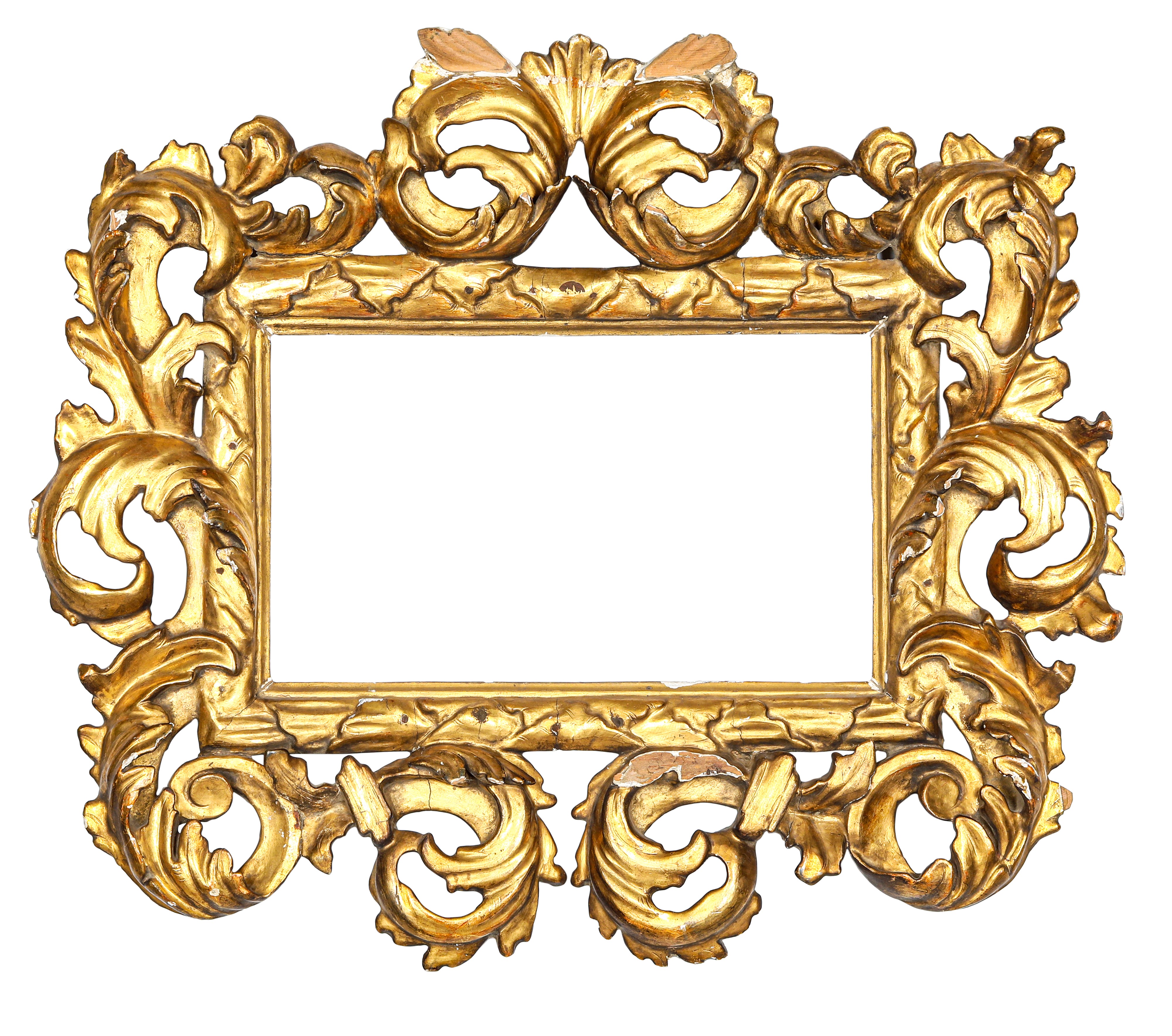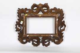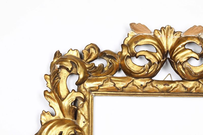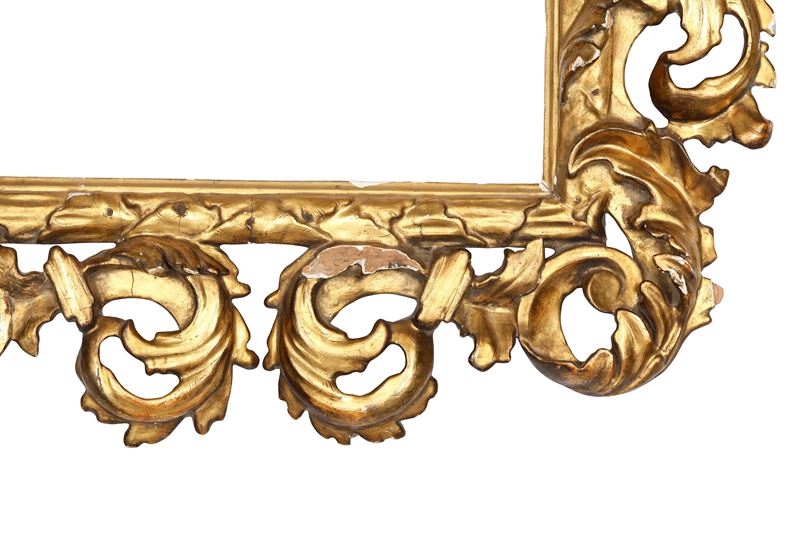 battuta a gola liscia seguita da fascia intagliata a motivo di foglie ricorrenti da cui si dipartono ampie volute a giorno impreziosite da girali di foglie