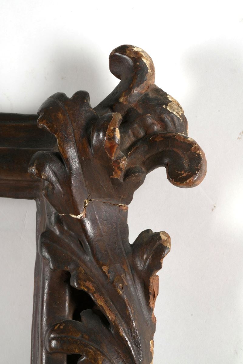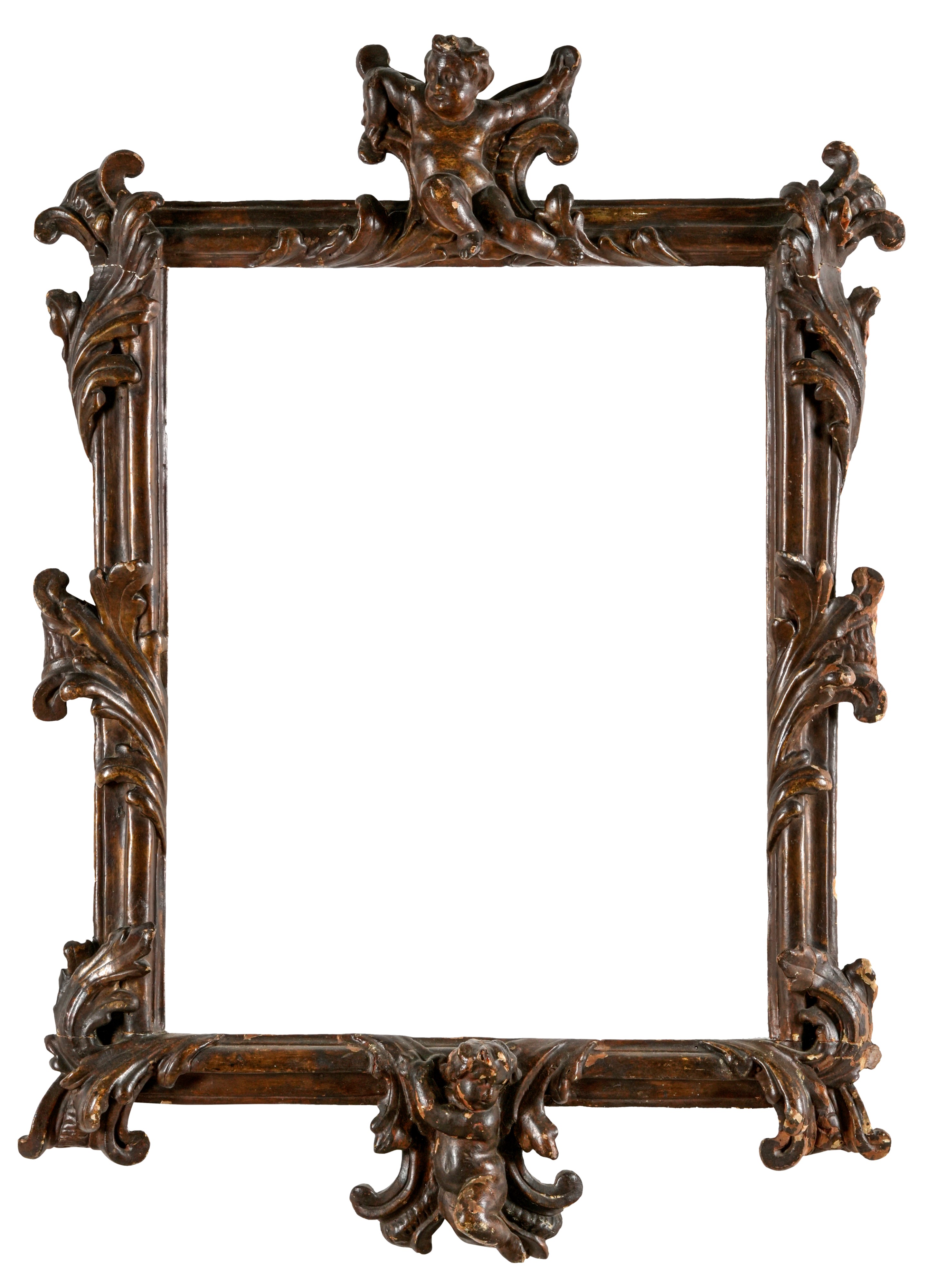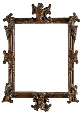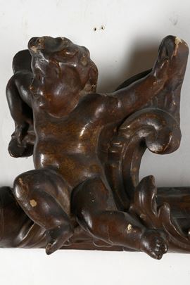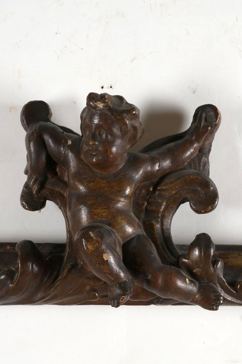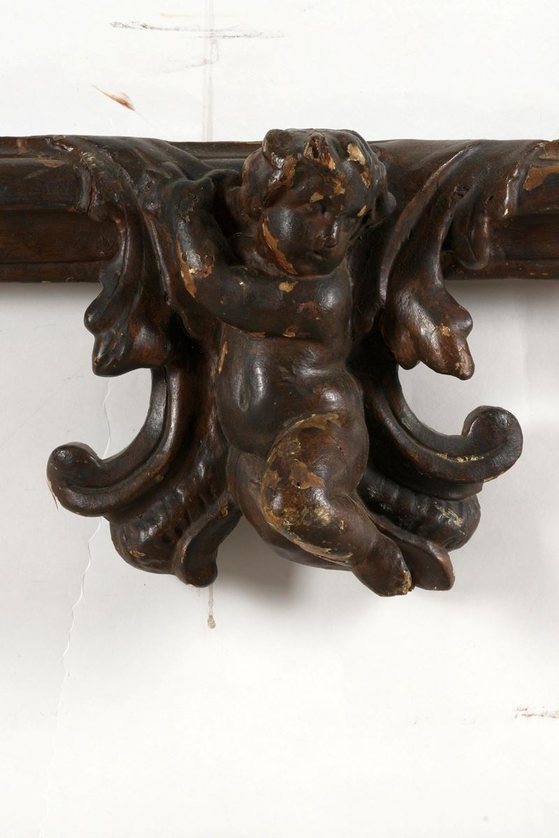 decori di volute fogliacee agli angoli e ai centri, putto sulla sommità e al centro della base