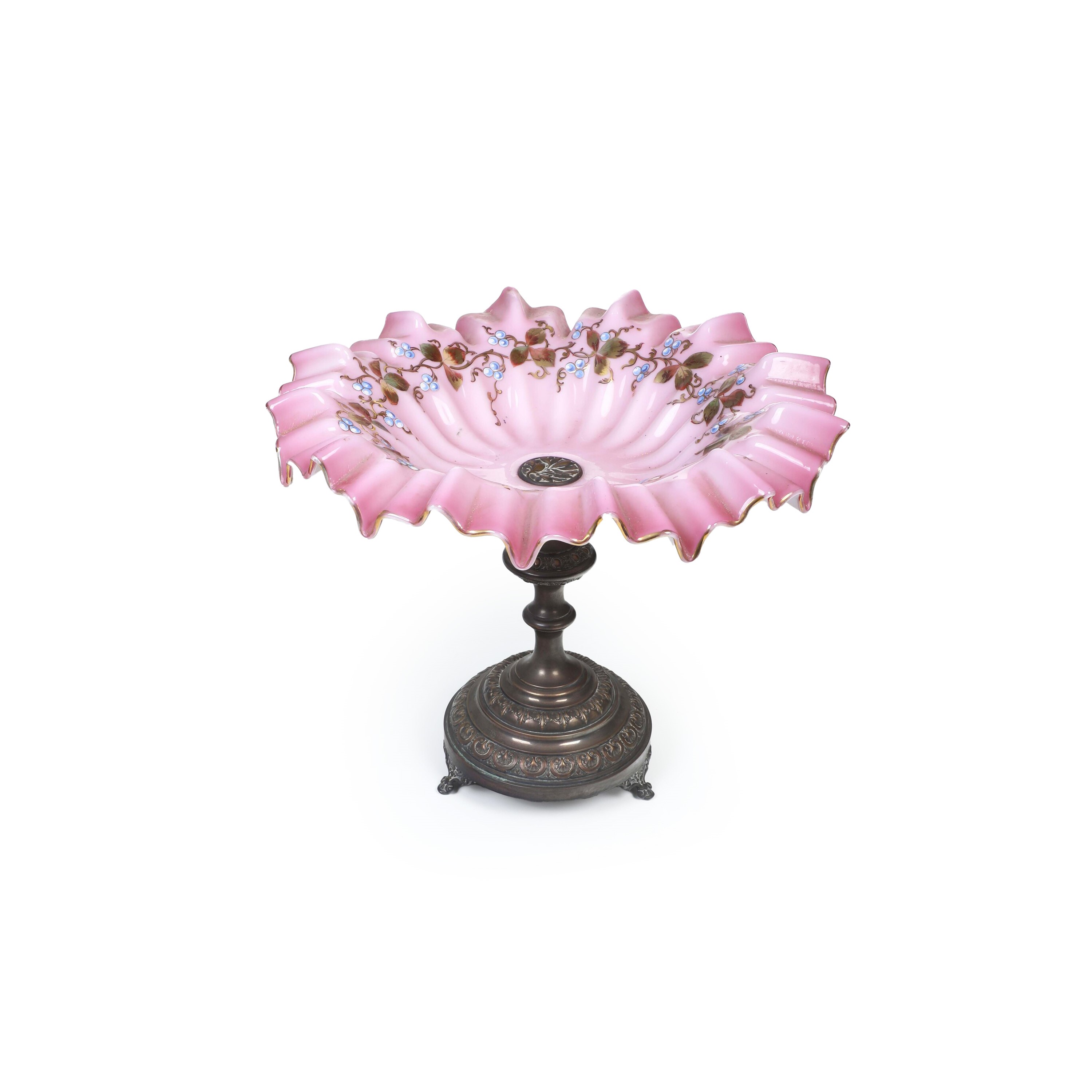 Vetro opalino decorato in policromia a smalti e oro, piede in ottone. Dimensioni: altezza cm 29; diametro cm 34. Conservazione: ottima; qualche usura all’oro.
