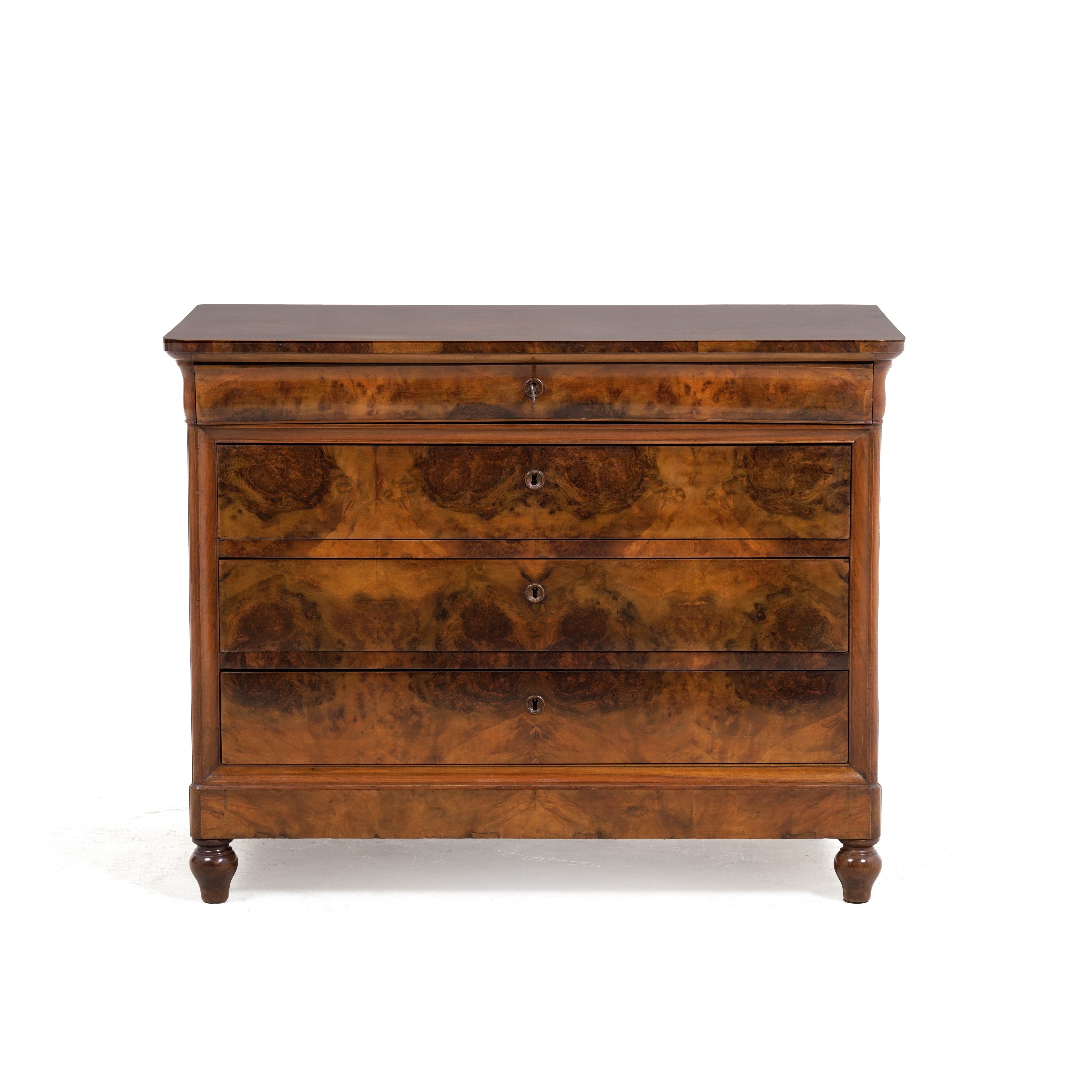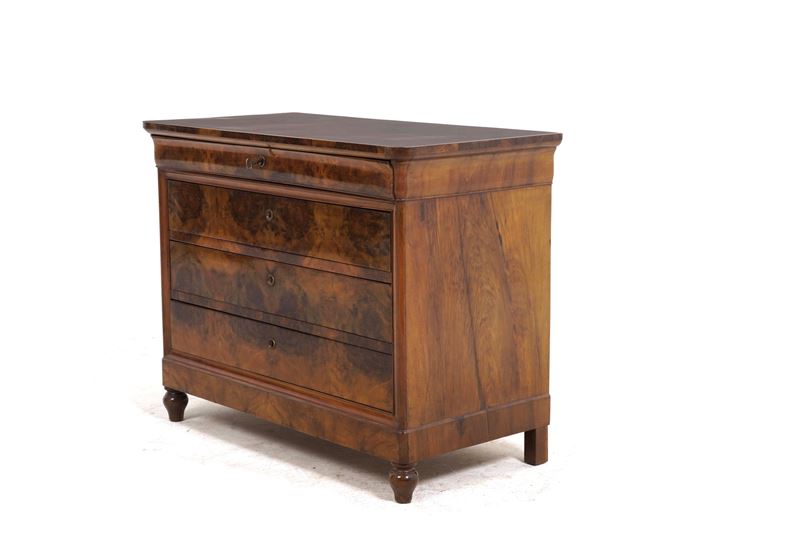 Cassettone lastronato in noce e radica. XIX secolo