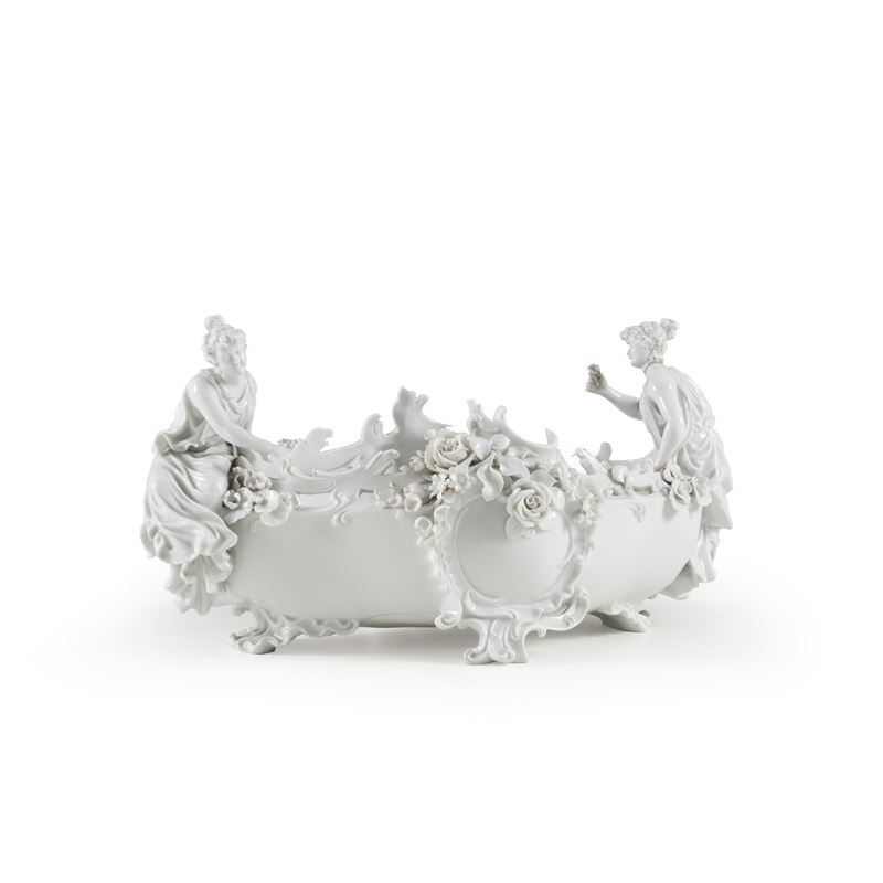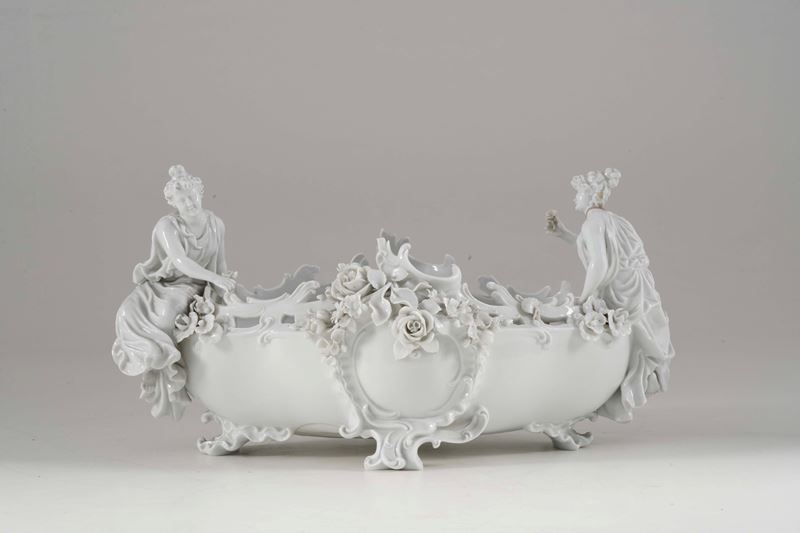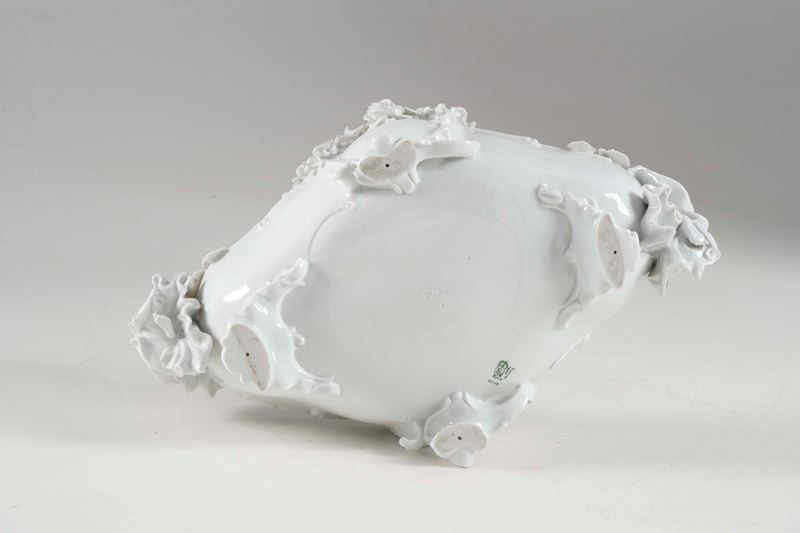 Porcellana bianca. Marca: simbolo grafico. Dimensioni: altezza cm 16,5; cm 33x cm 18,5. Conservazione: testa di una ninfa incollata; mancanze minori.