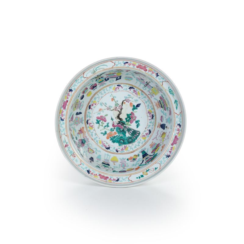 Ciotola in porcellana Famiglia Rosa raffigurante fenice con decori a motivi geometrici e vegetali, Cina, Dinastia Qing, [..]