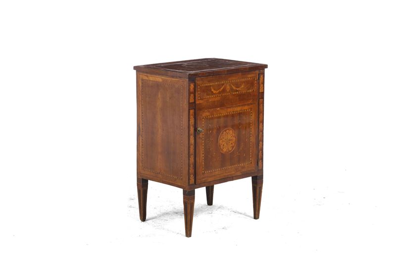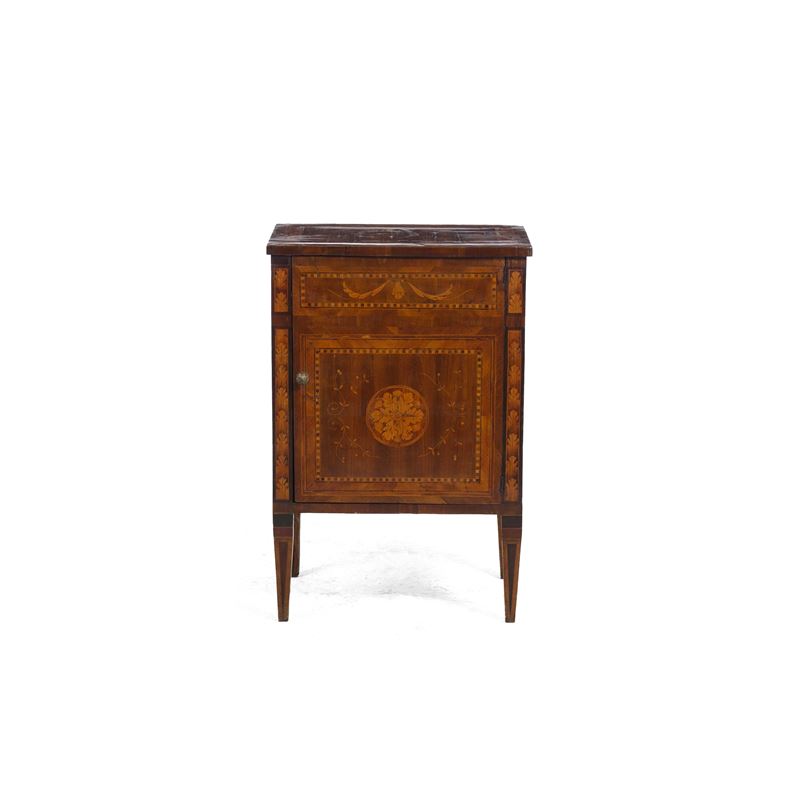 Legno lastronato, filettato e intarsiato. Fronte a uno sportello, piedi rastremati, decori floreali