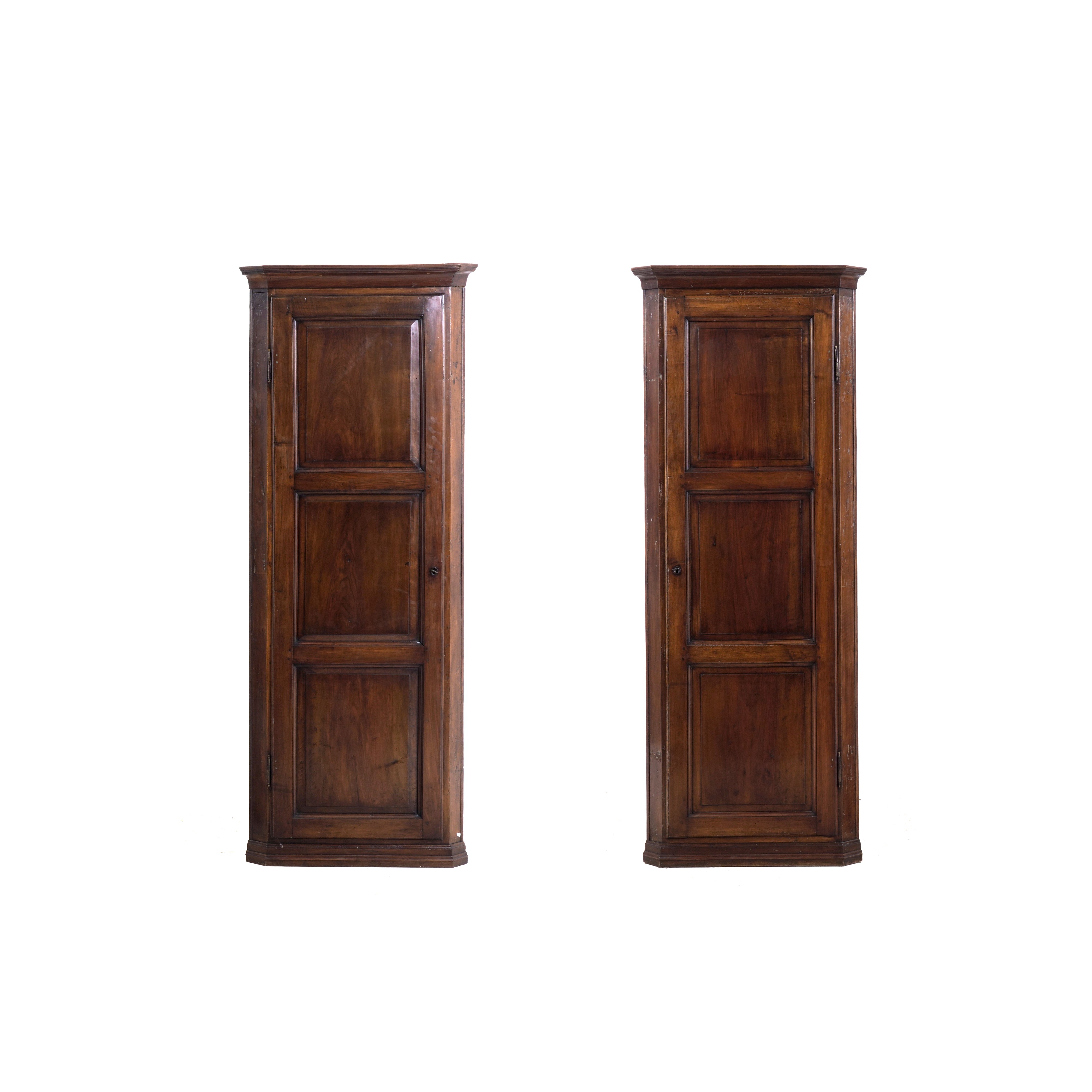 Coppia di angoliere in noce ad un'anta, elementi antichi
