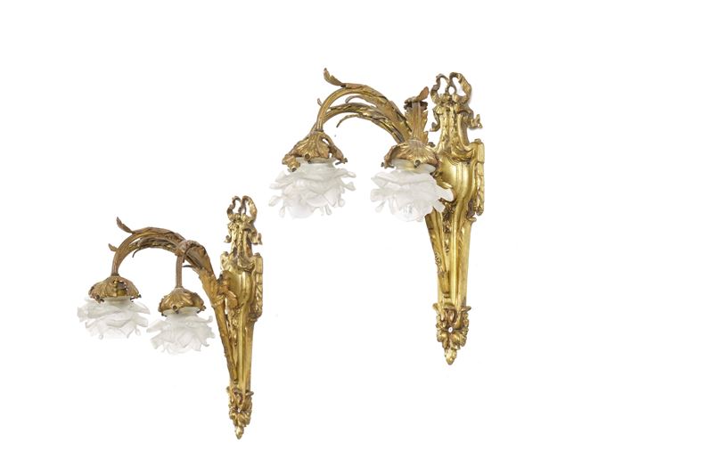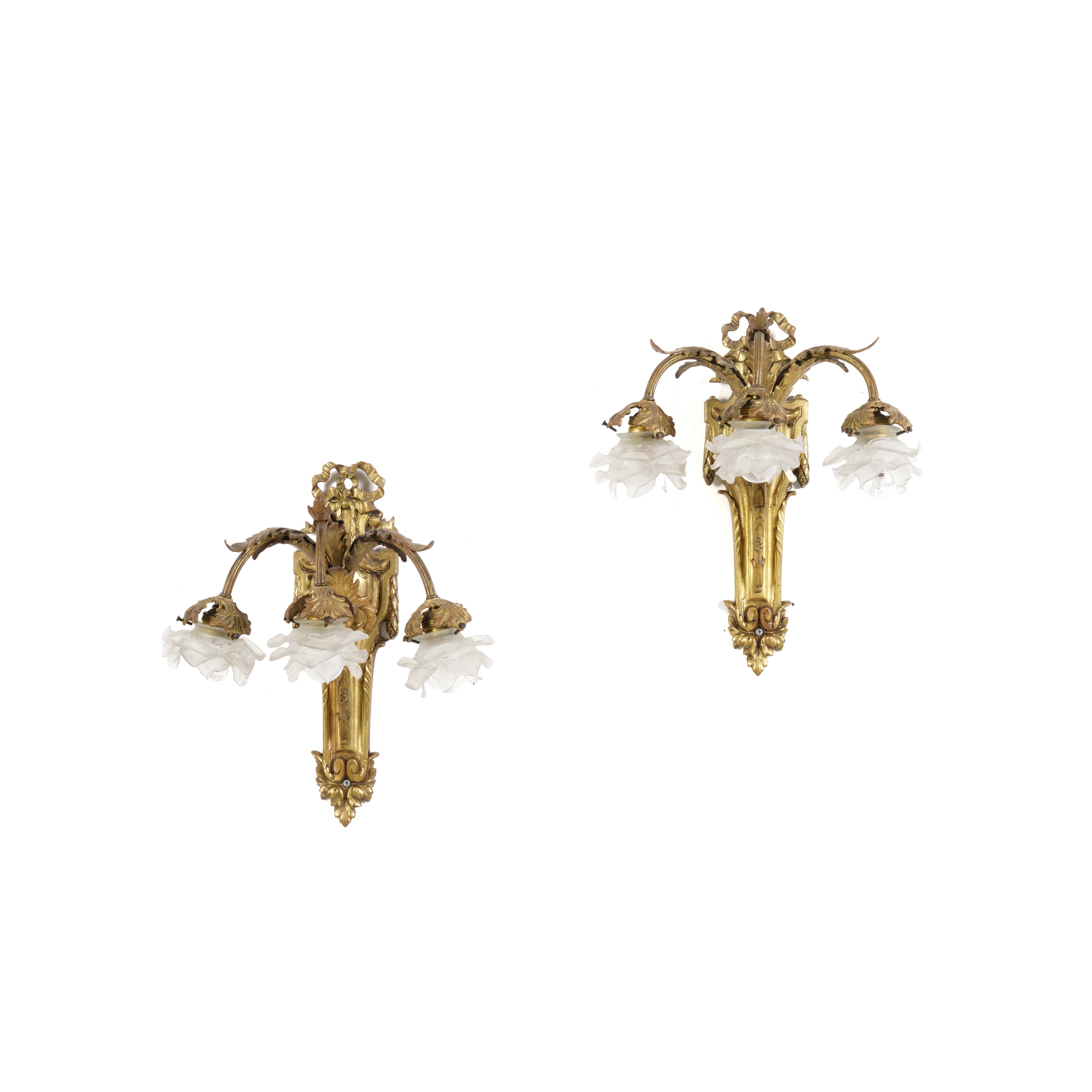 Metallo dorato, a tre luci, con paralumi in vetro opaco a foggia di fiori, cimasa a fiocco