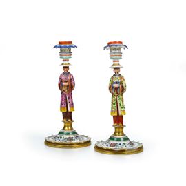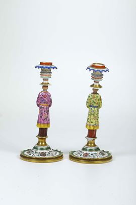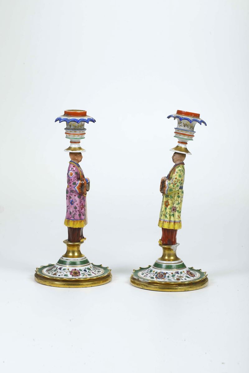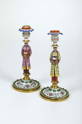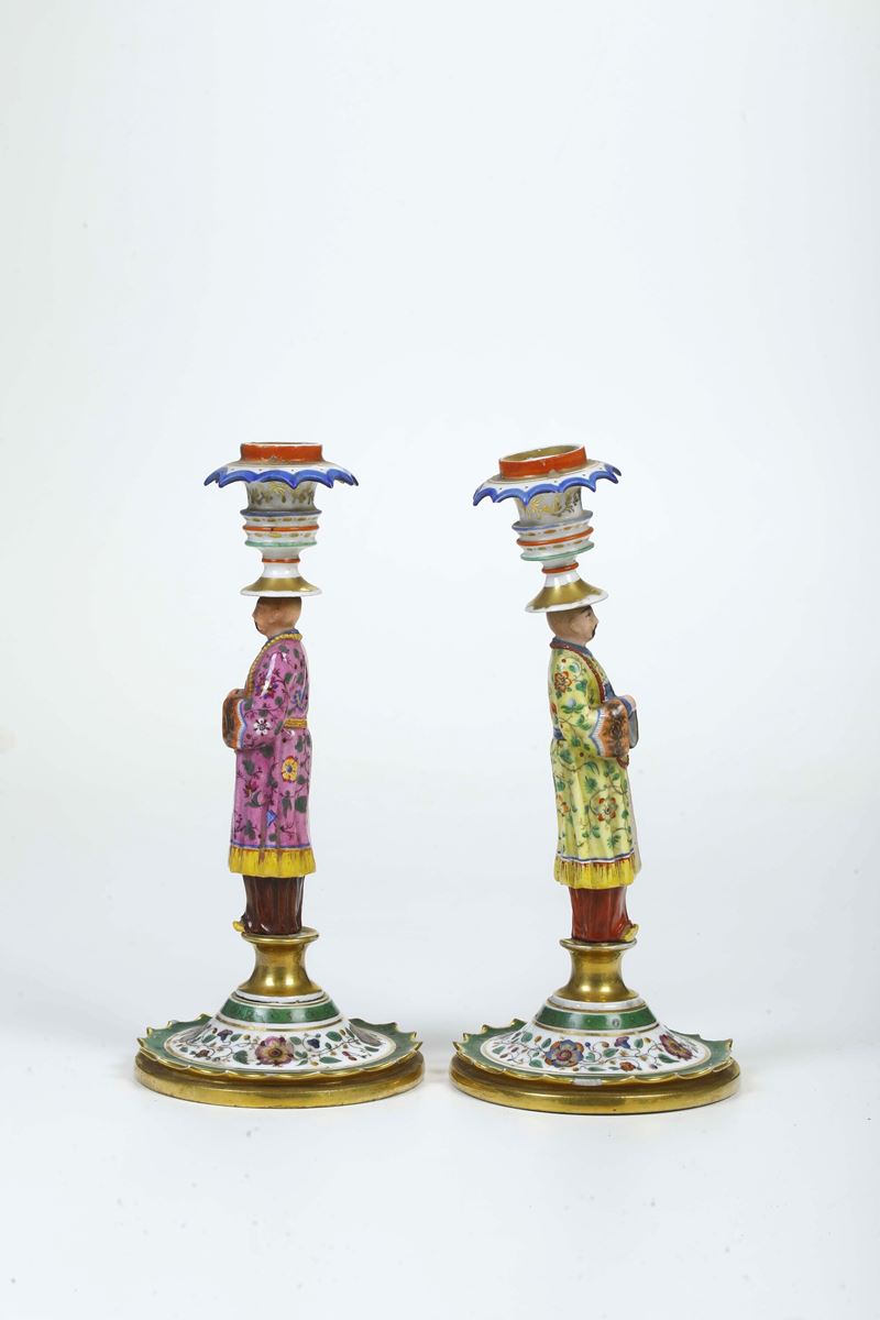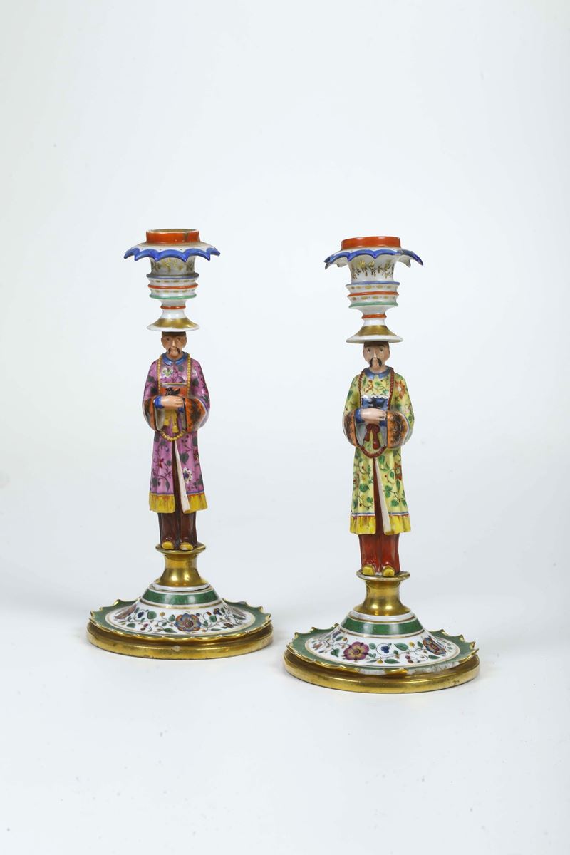 Coppia di candelieri. Francia, alla maniera di Jacob Petit, XIX secolo.