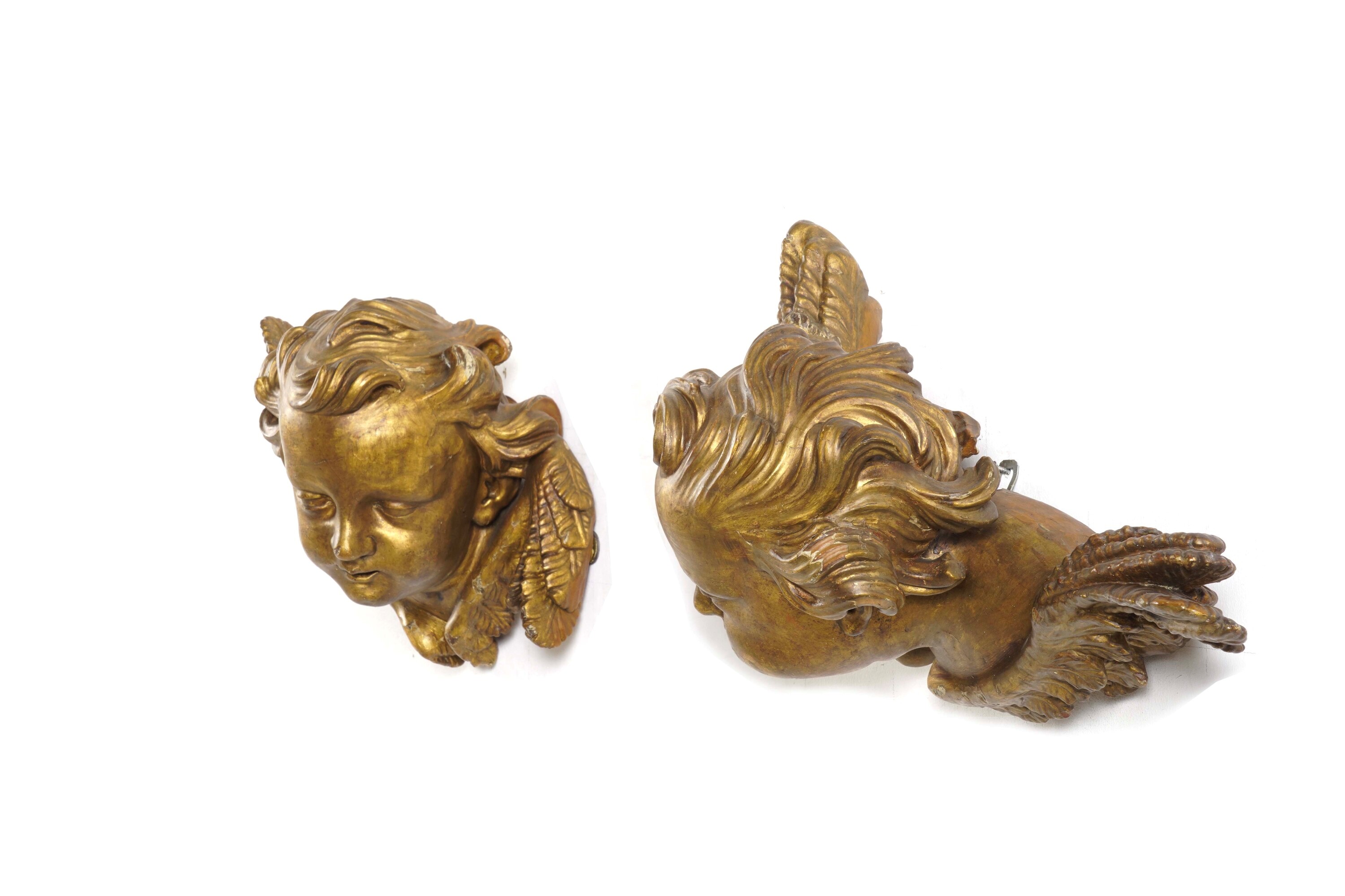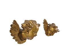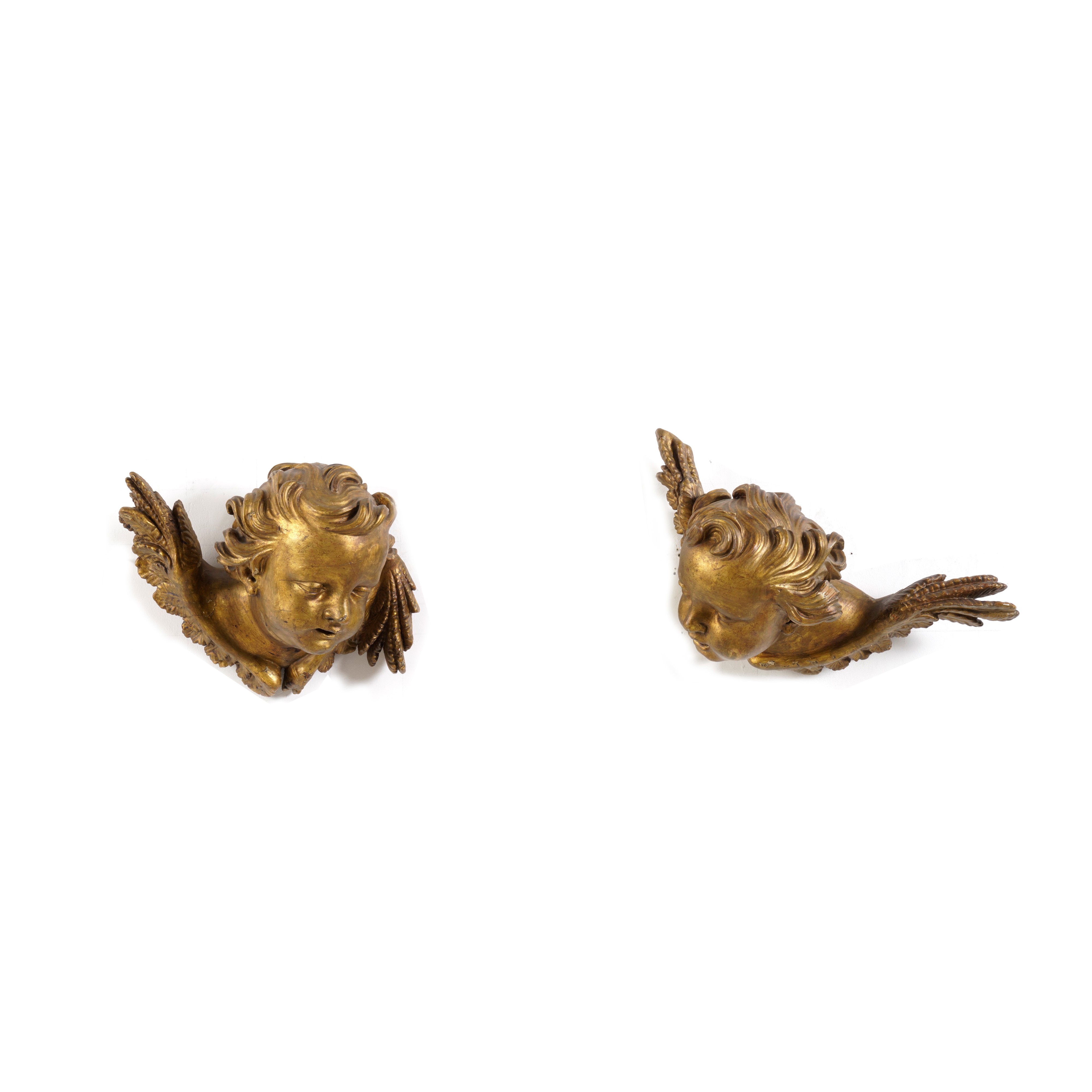 Coppia di cherubini in stile in legno intagliato e dorato. XVIII secolo