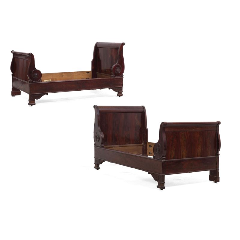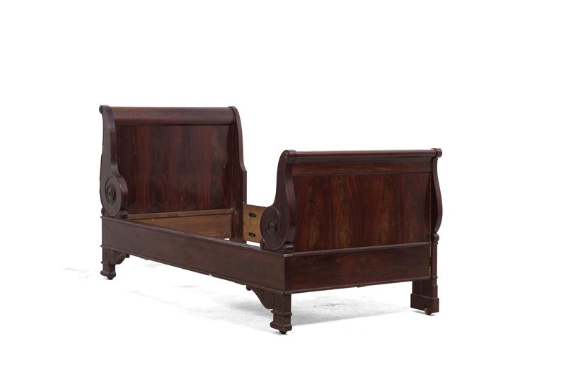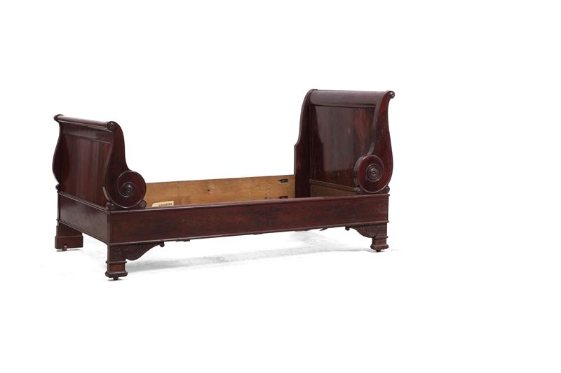 Mogano intagliato. Testiera e pediera terminanti a volute
