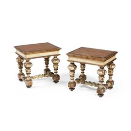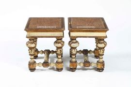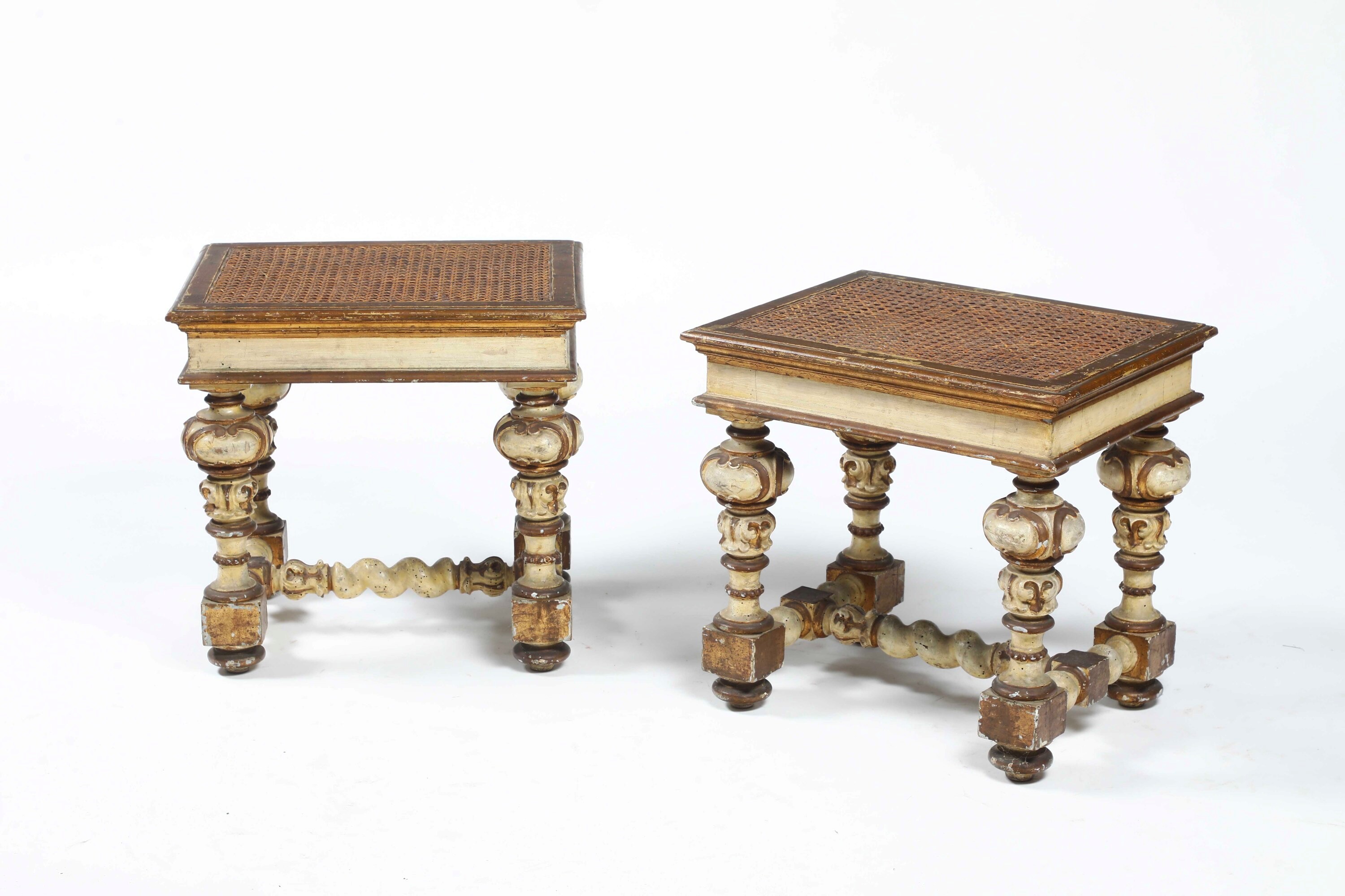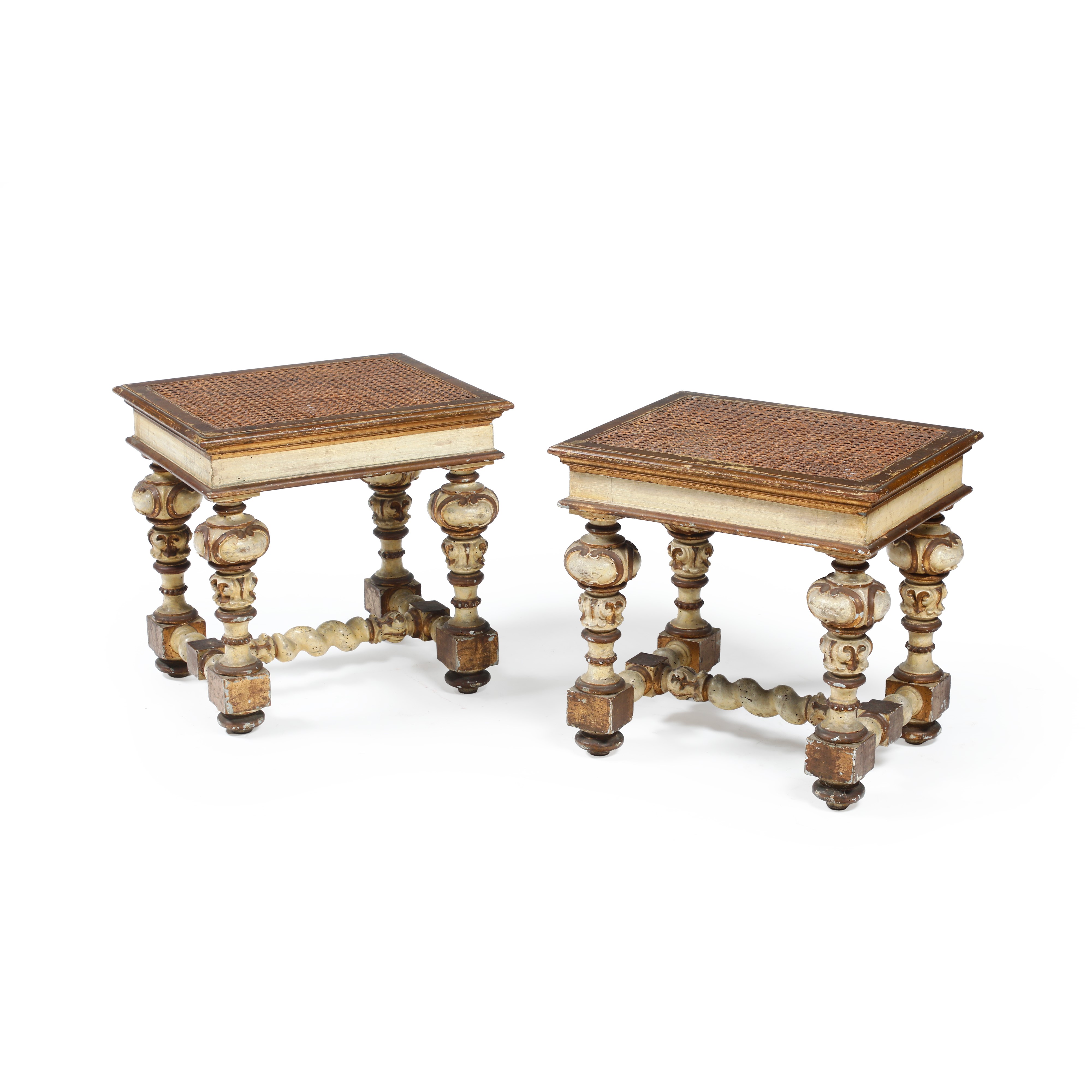 Legno intagliato, laccato e dorato. Gambe sagomate e tornite a torciglione, piani in canneté