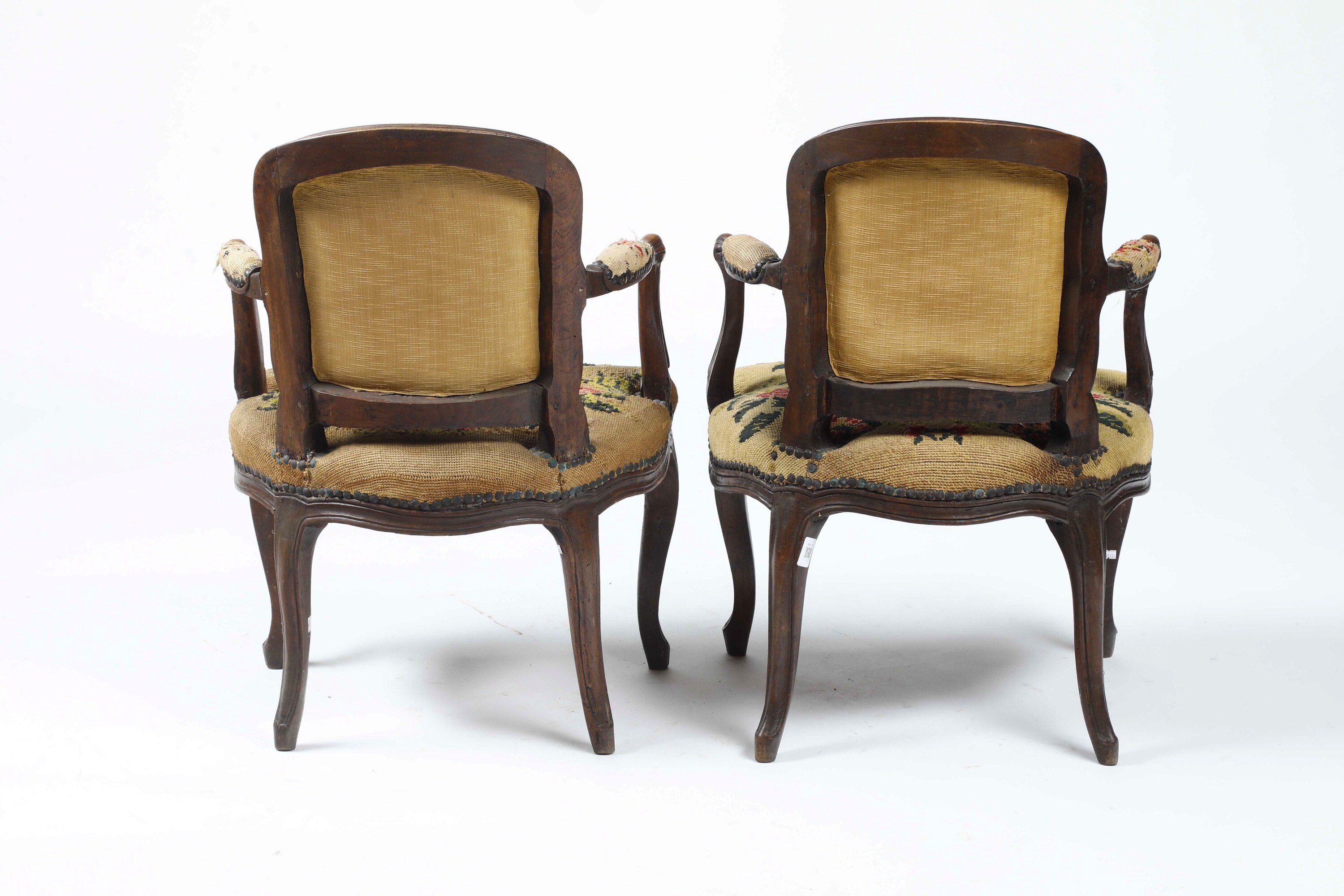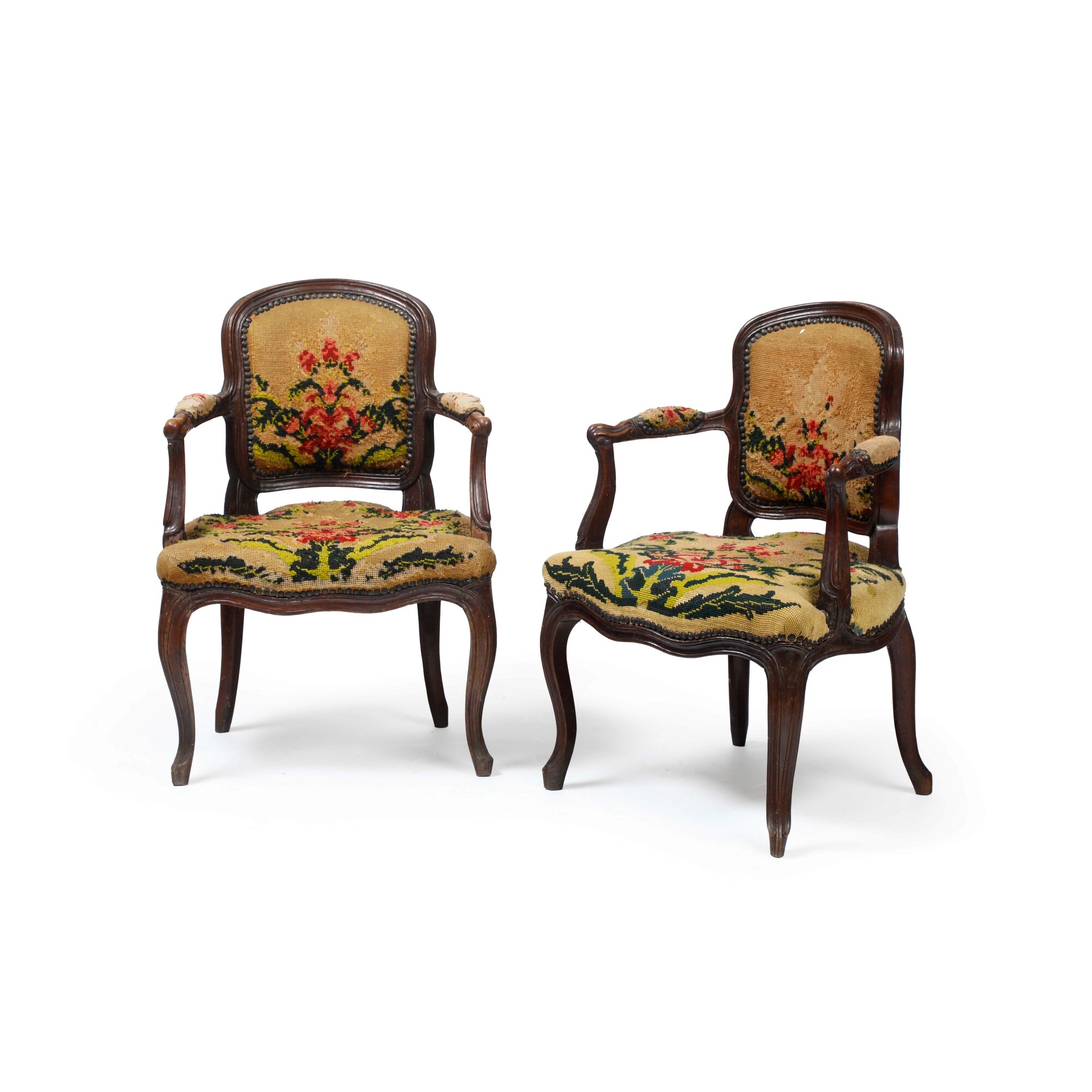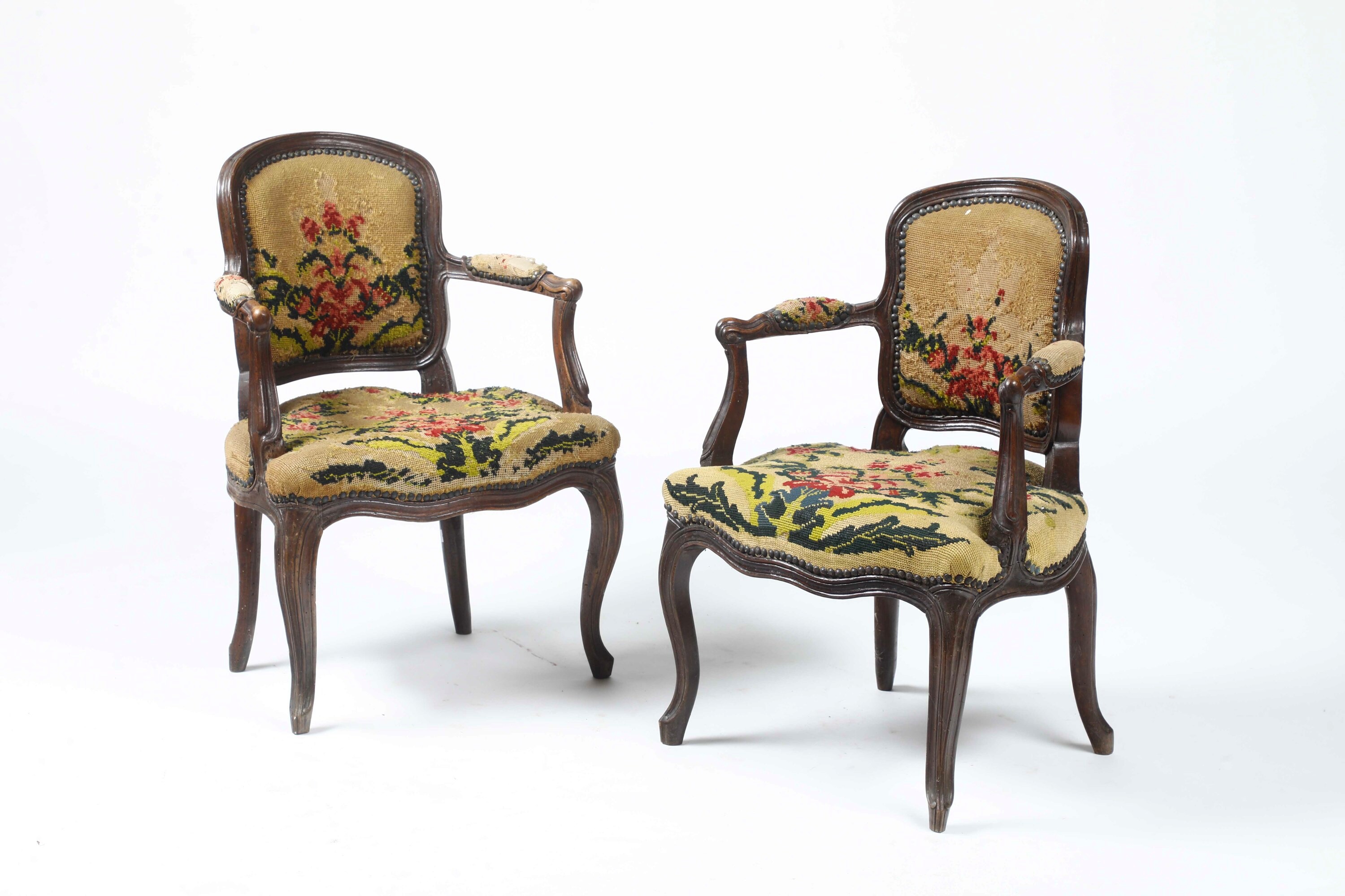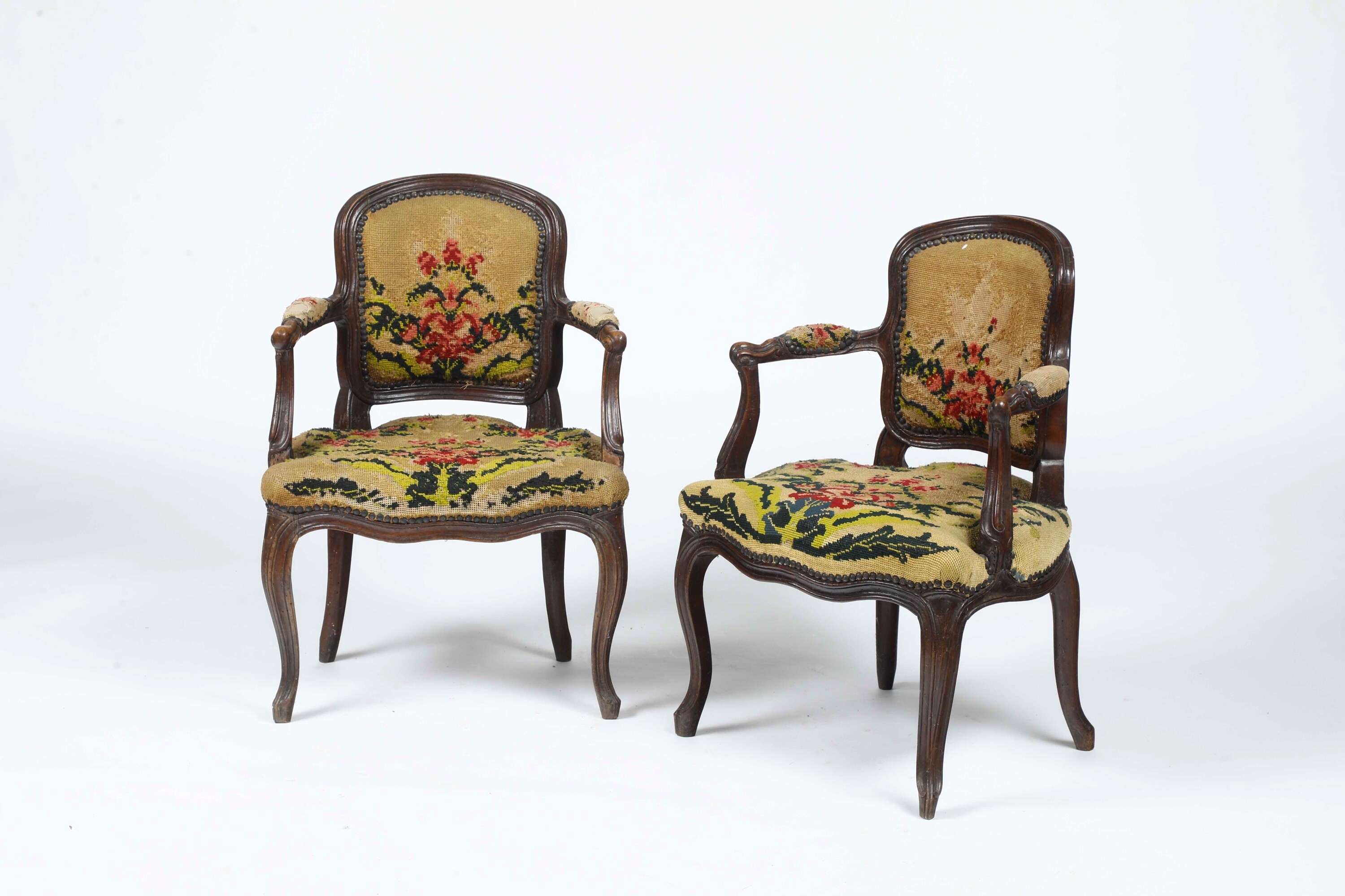 Legno intagliato. Schienale sagomato, gambe e braccioli mossi, imbottite e rivestite con ricamo floreale a piccolo punto
