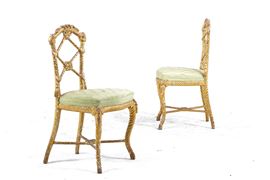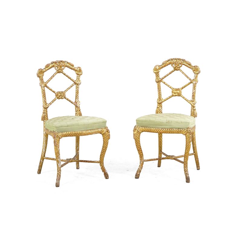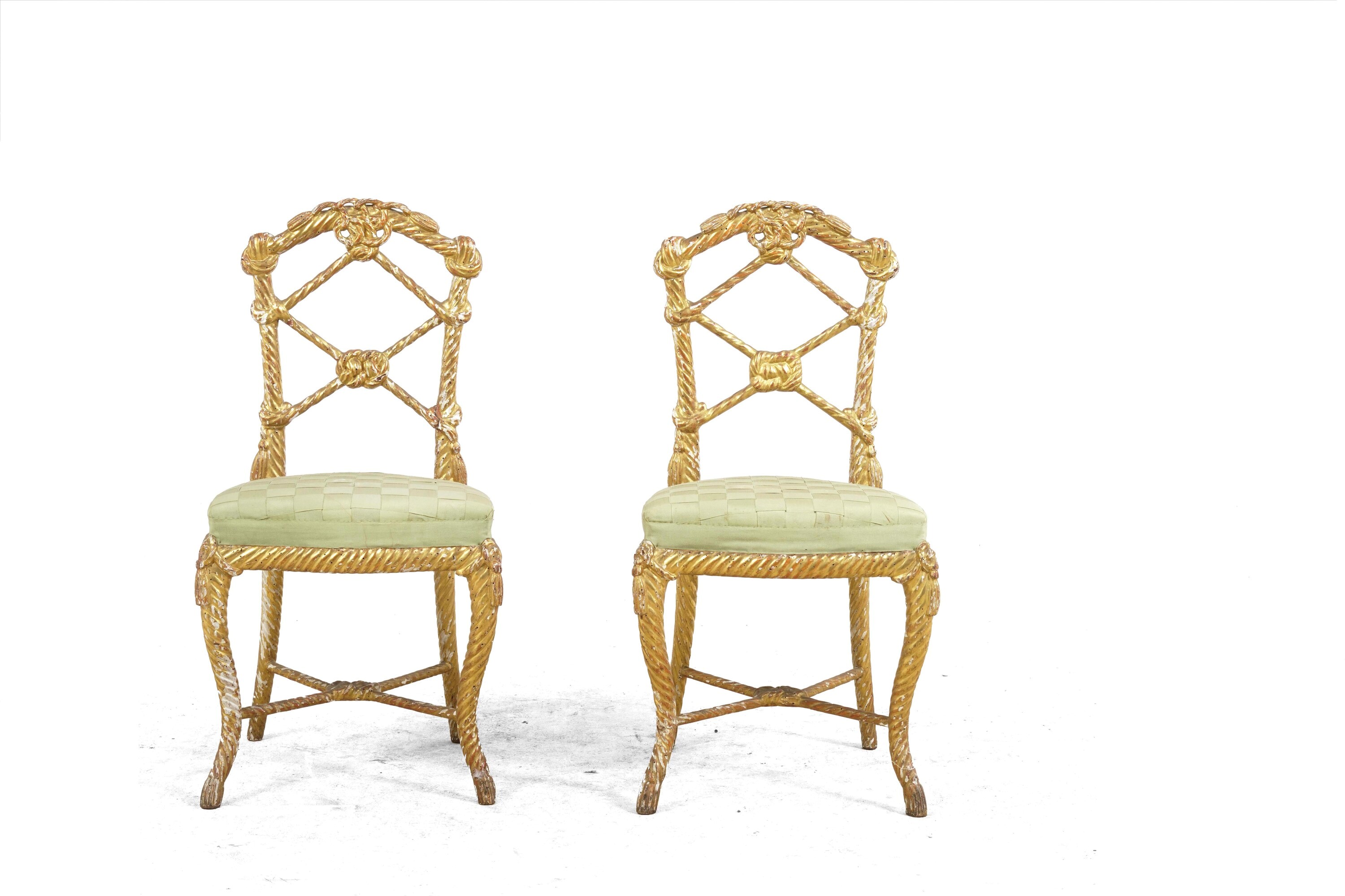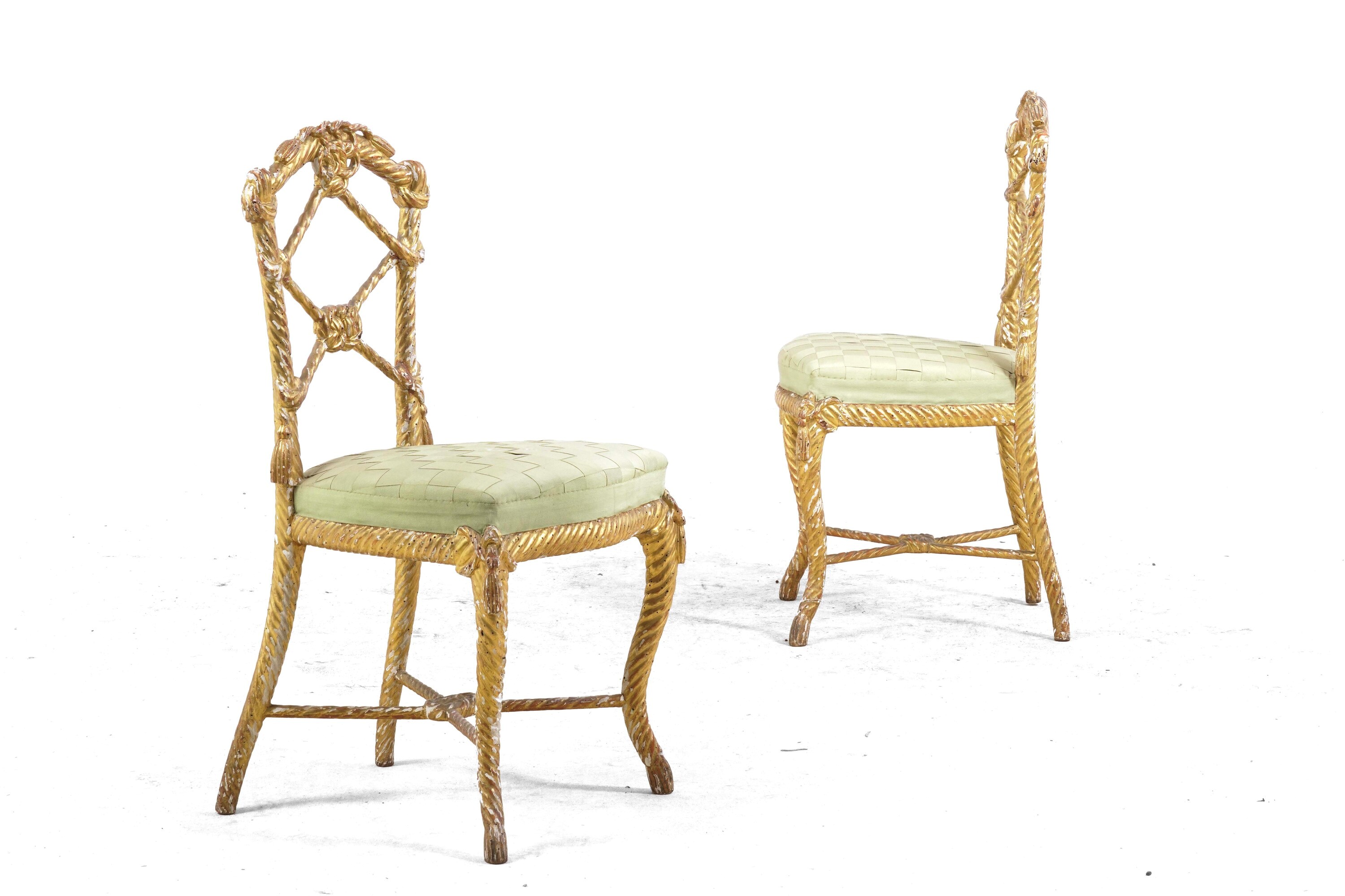 Legno intagliato e dorato in forma di corde che si intrecciano e si annodano a formare la struttura. Seduta imbottita
